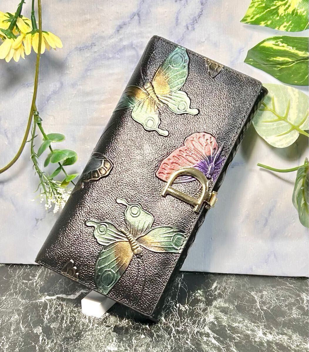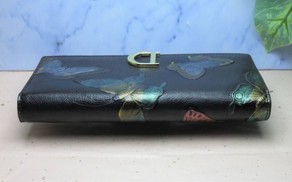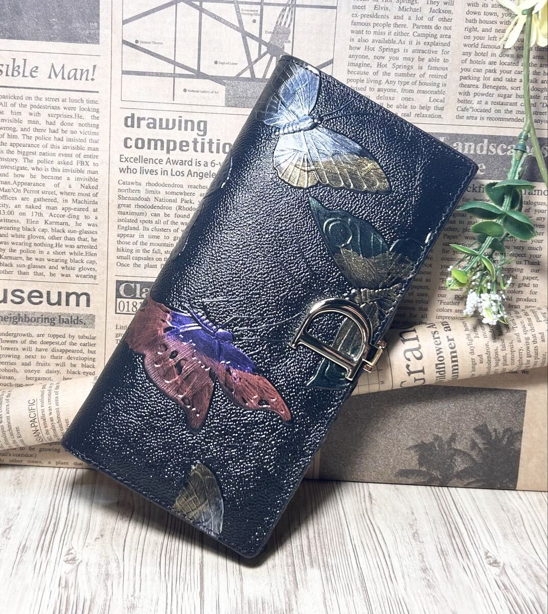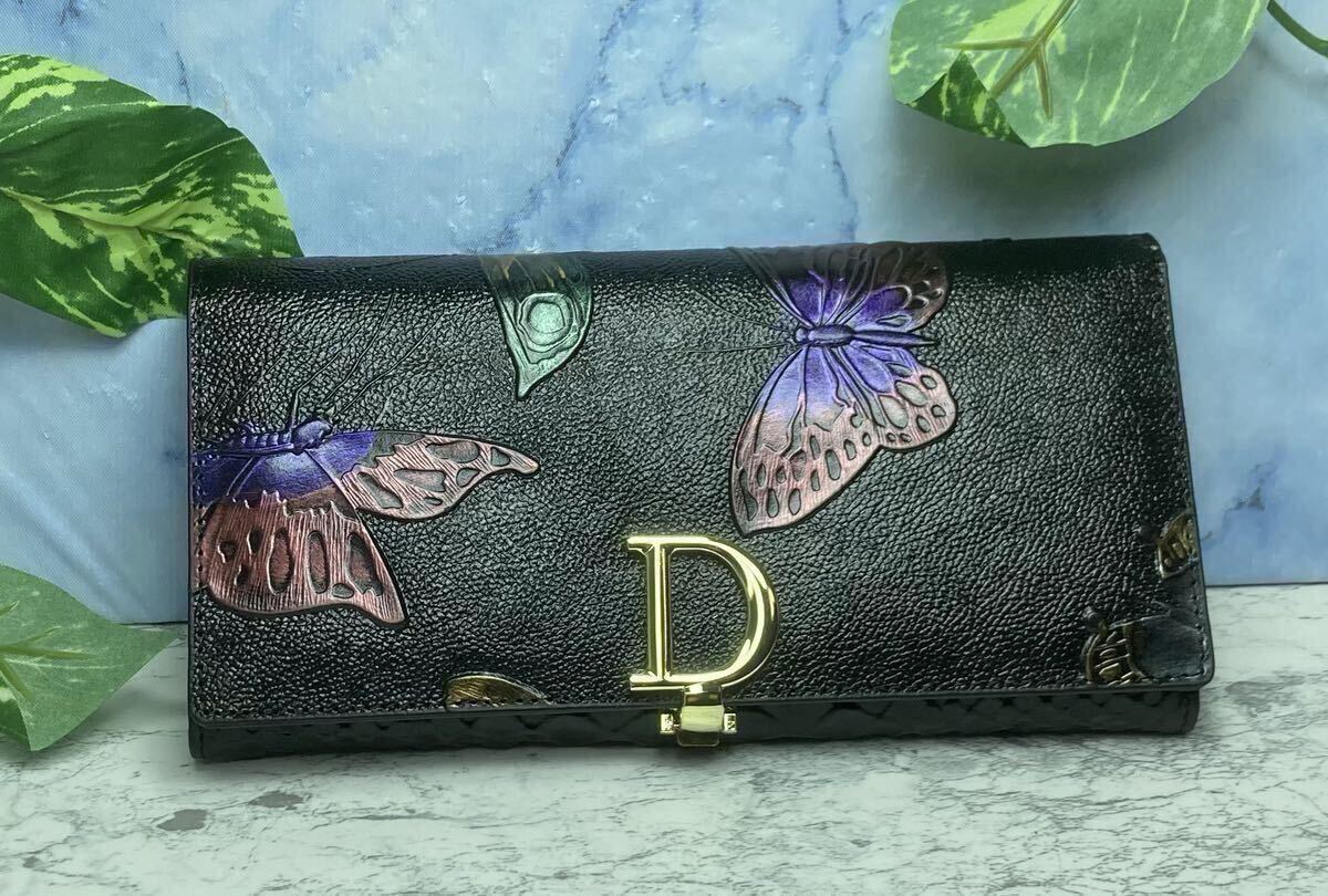金属Dマークに蝶々柄の長財布本革牛革ウォレット黒に薄め蝶々柄入り、高級デザインで、機能性にも
