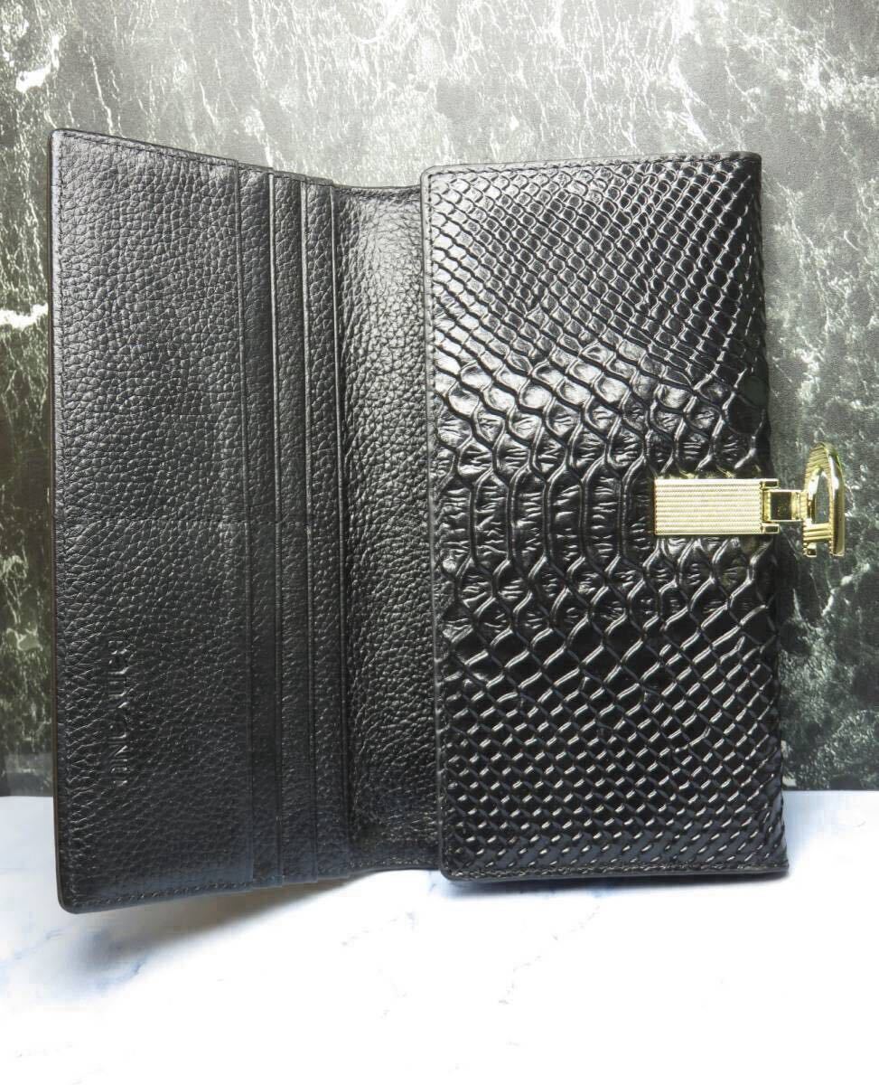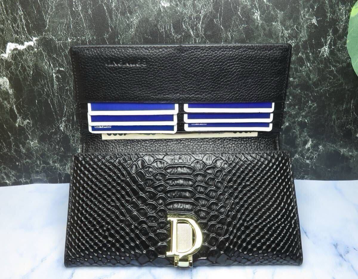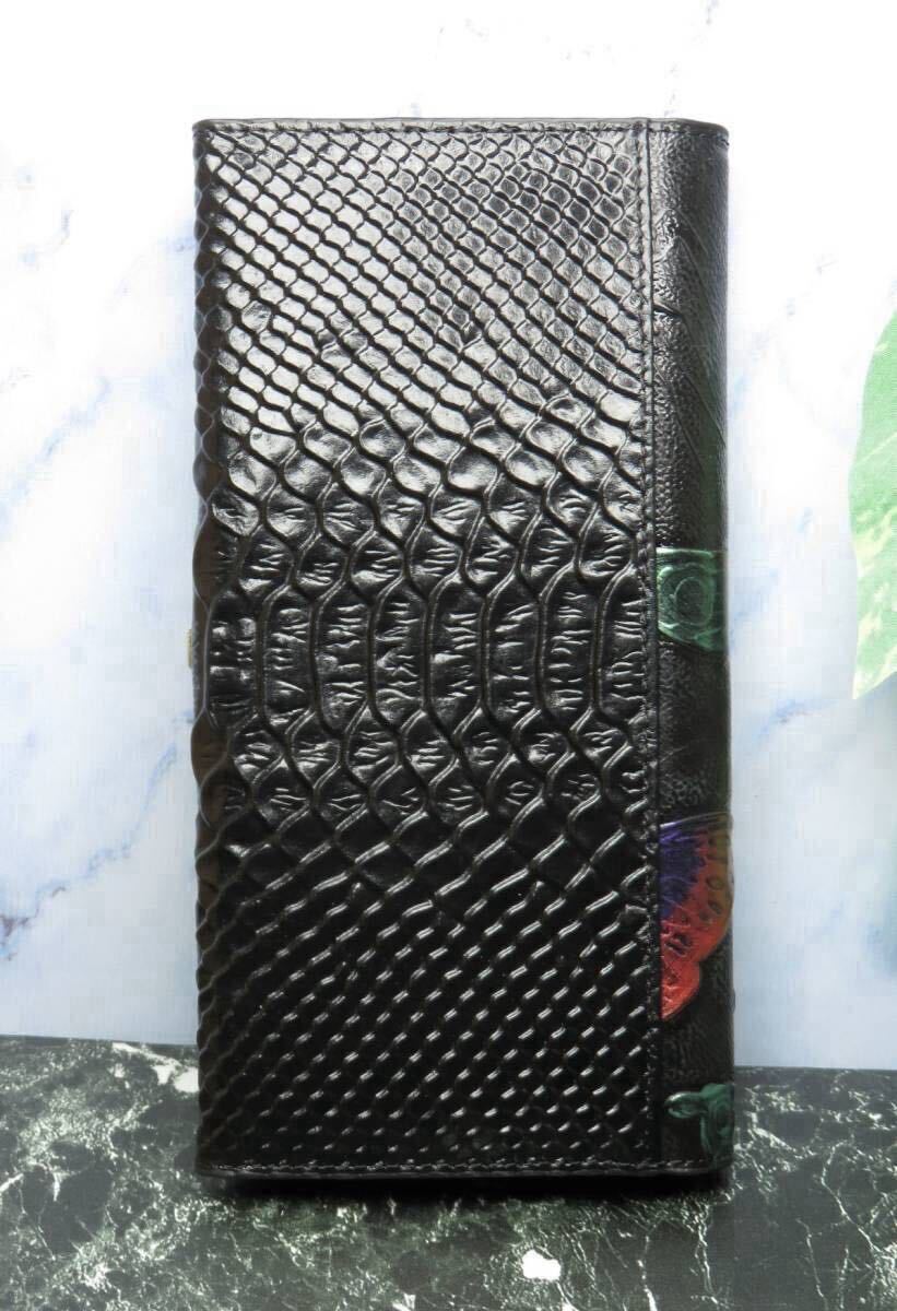 金属Dマークに蝶々柄の長財布本革牛革ウォレット黒に薄め蝶々柄入り、高級デザインで、機能性にも
