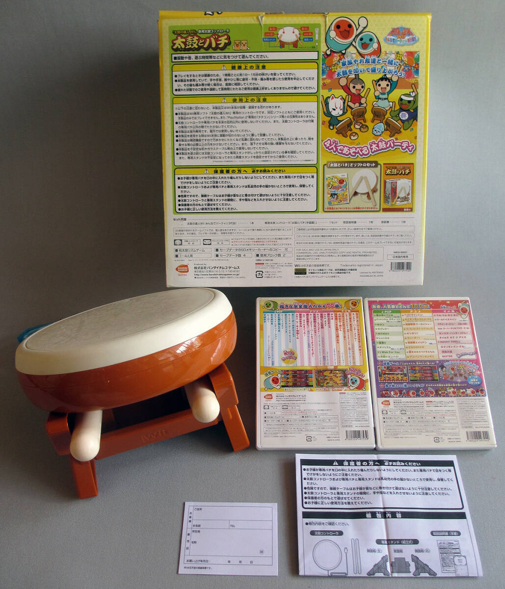 ・太鼓とバチ、台座、保証書(未記入)、取扱説明書x3、ケースx2、ジャケットx2、内箱x2(1つ分離)、外箱