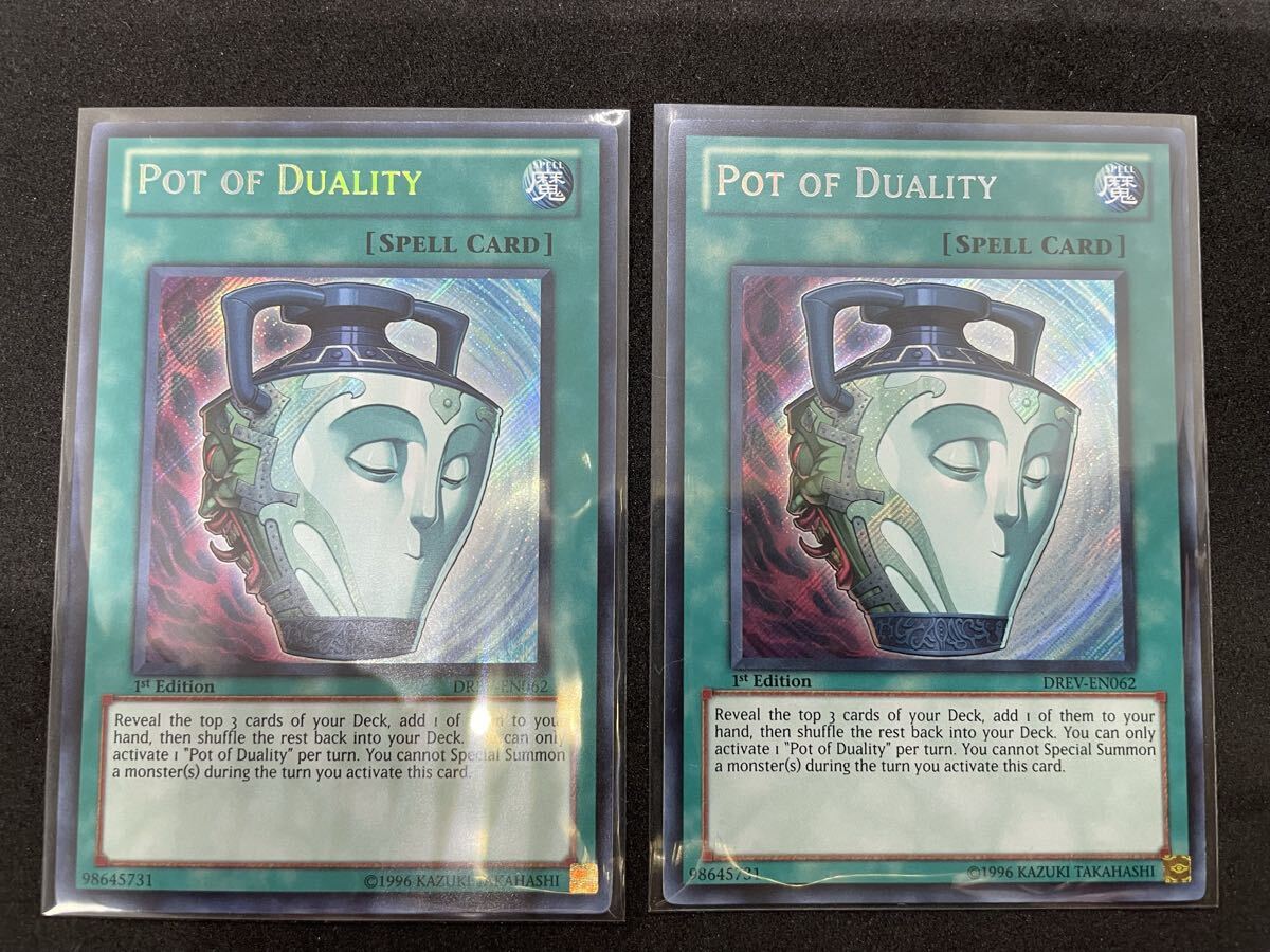 遊戯王の英語版DUELIST REVOLUTIONに収録されている「強欲で謙虚な壺(シークレット)」の2枚セットです。2枚とも1stになります。