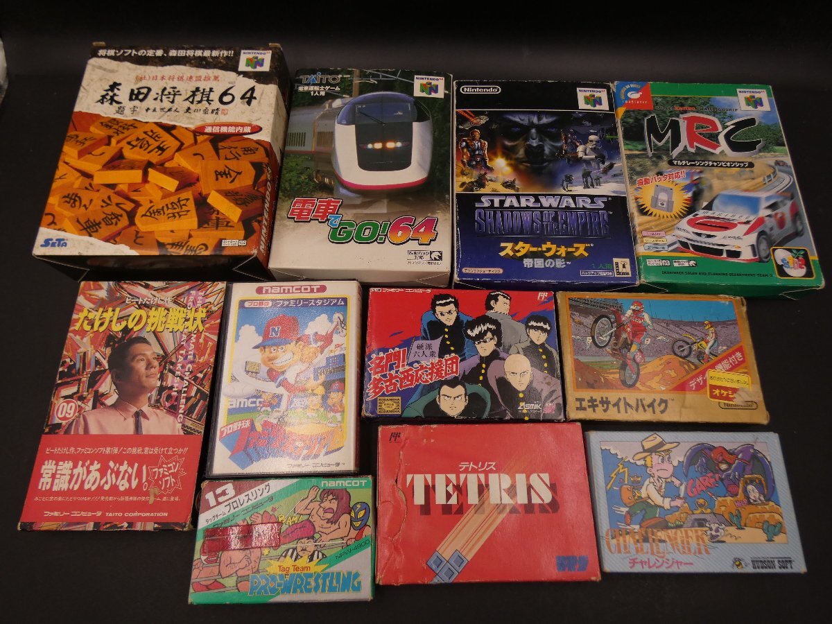 ファミコンとニンテンドー64のソフトを11本おまとめです。 ・ニンテンドー64:「森田将棋64」「電車でGO!64」「MRCマルチレーシングチャンピオンシップ」「スター・ウォーズ 帝国の影」。 ・ファミコン:「たけしの挑戦状」「名門!多古西応援団」「ファミリースタジアム」「エキサイトバイク」「タッグチーム プロレスリング」「テトリス」「チャレンジャー」。 の計11本。 ・全て当方で動作確認はしていませんのでジャンク品とお考え下さい。 ・ソフト外観に破損はありませんが、付属品の欠品がある物、箱に破損がある物、取扱説明書が破れている物も混在です。また、全てが個人宅の長期保管品ですので、箱に汚れあり。 ・画像でご判断いただきご検討をお願い致します。 | ||