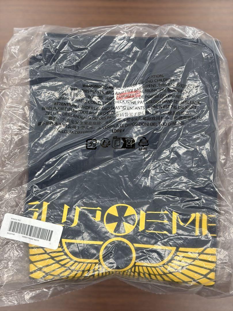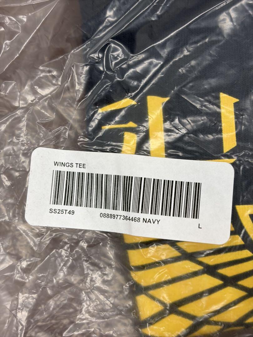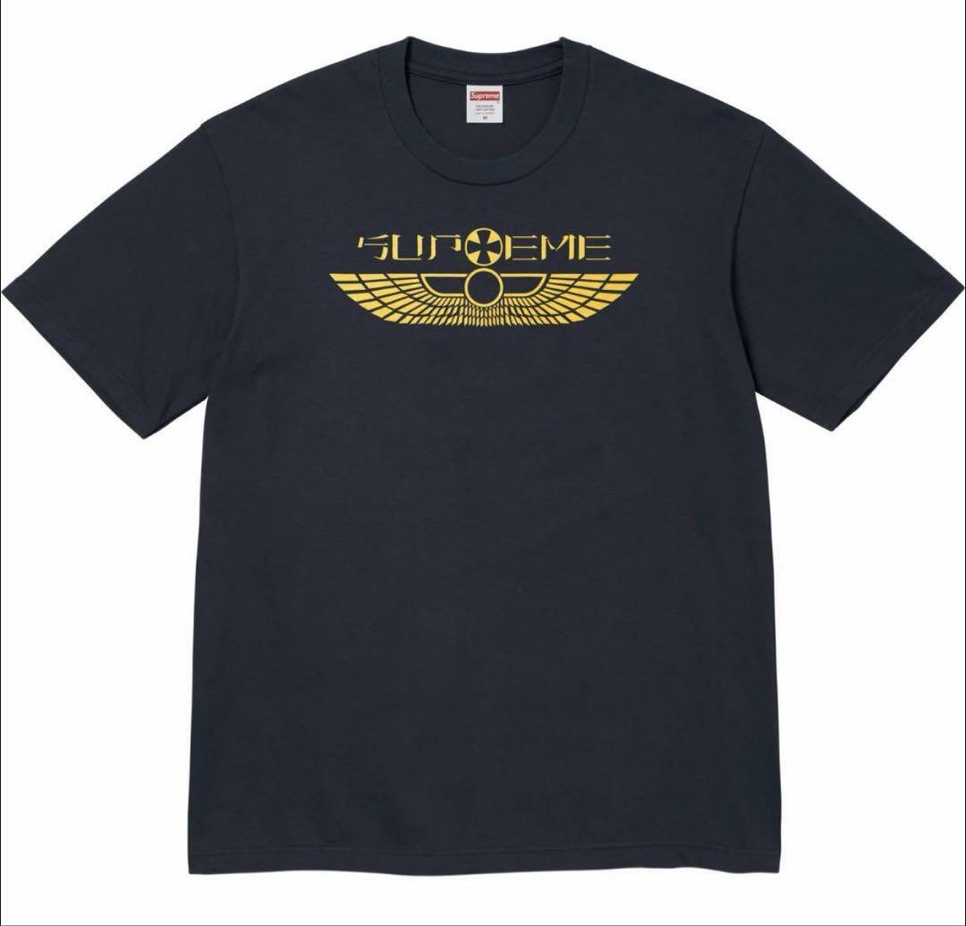 ウィングスロゴが特徴のネイビーTシャツ。 未開封品です 2025年モデル - ブランド: SUPREME - デザイン: ウィングスロゴ - サイズ: L - 色: ネイビー