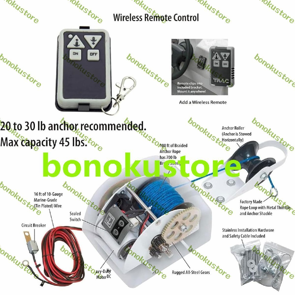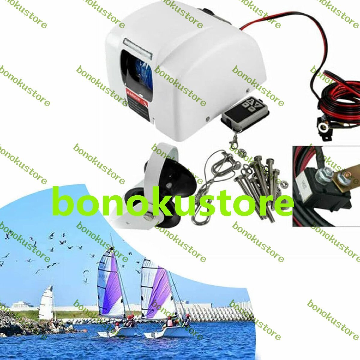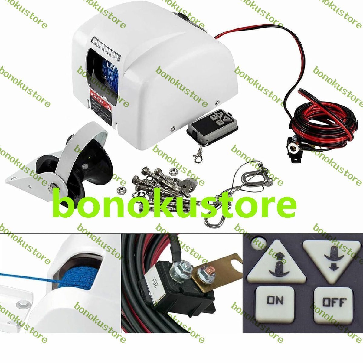 防水スイッチ: アンチリバース内部クラッチを介してアンカーをアクティブまたは非アクティブにし、自由な引っ掛かりを防ぎます。ウインチの寸法 (長さ x 幅 x 高さ): 10 インチ x 9.75 インチ x 5.75 インチ、10 ゲージのマリングレードバッテリーケーブル付き (錫メッキワイヤ長さ 4.9m)