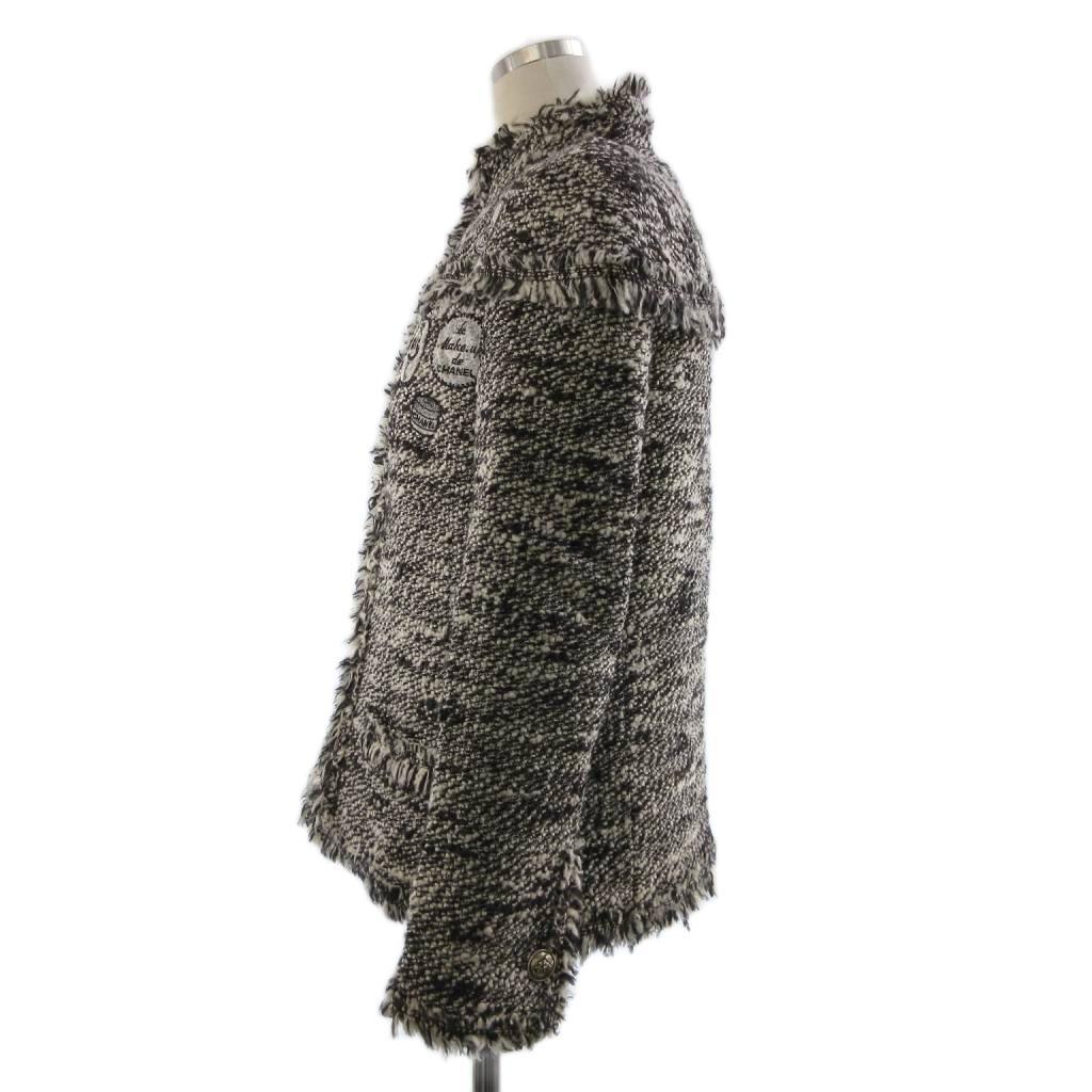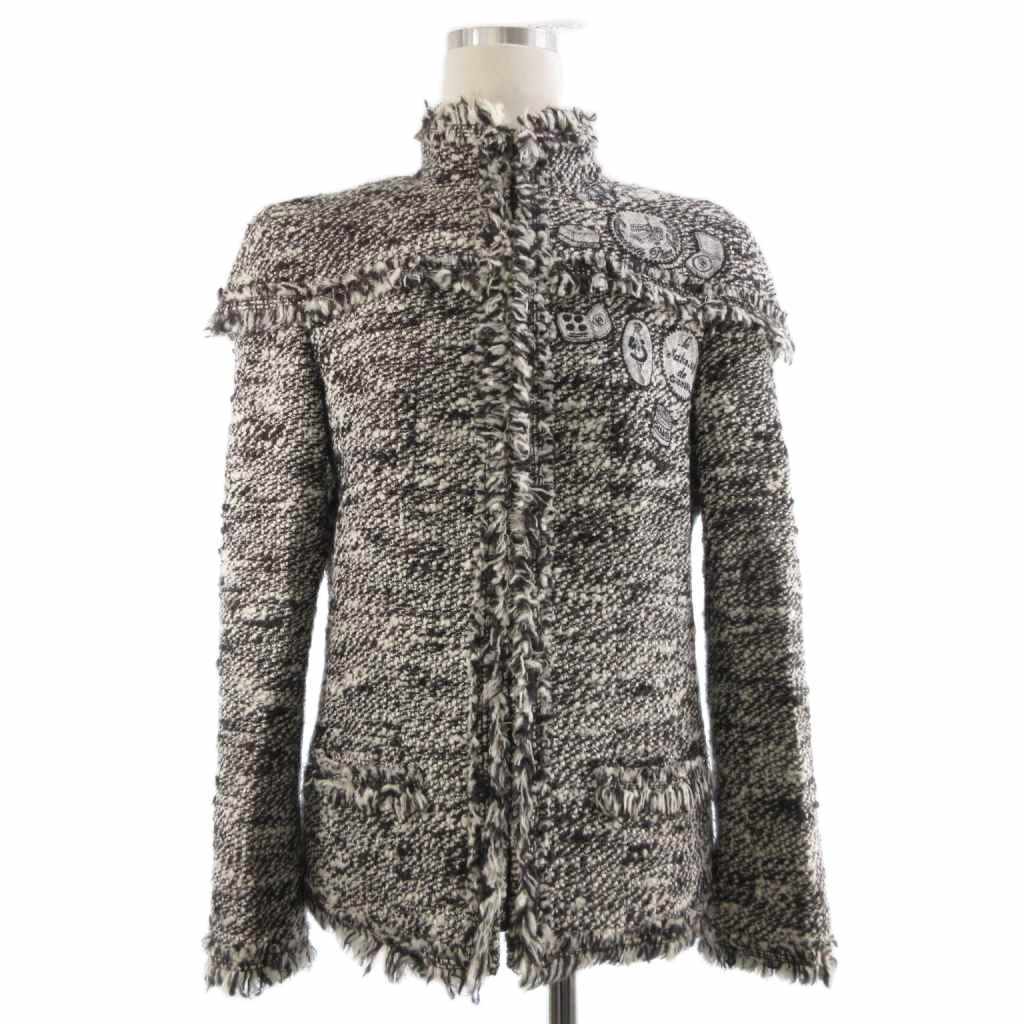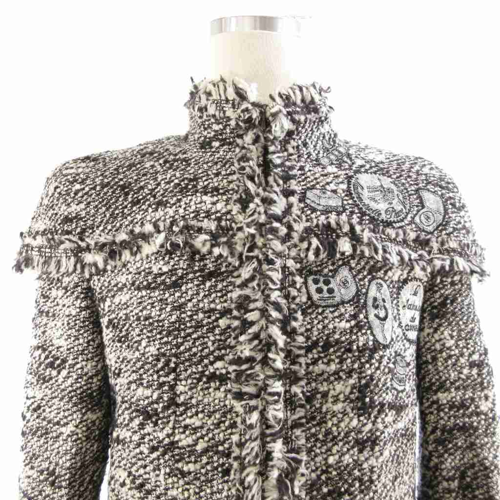 シャネル CHANEL 2004 Fall Winter Collection by Karl Lagerfeld メイクアップ ジャケット ジップアップ ツイード ワッペン フリンジ 黒 白 40 L相当