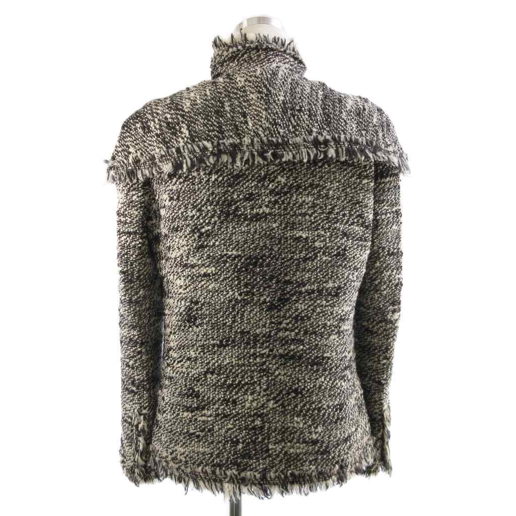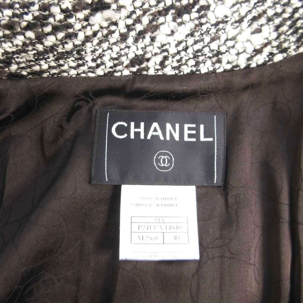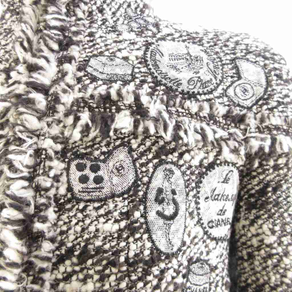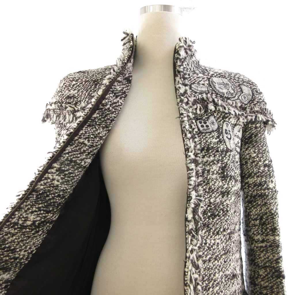 シャネル CHANEL 2004 Fall Winter Collection by Karl Lagerfeld メイクアップ ジャケット ジップアップ ツイード ワッペン フリンジ 黒 白 40 L相当