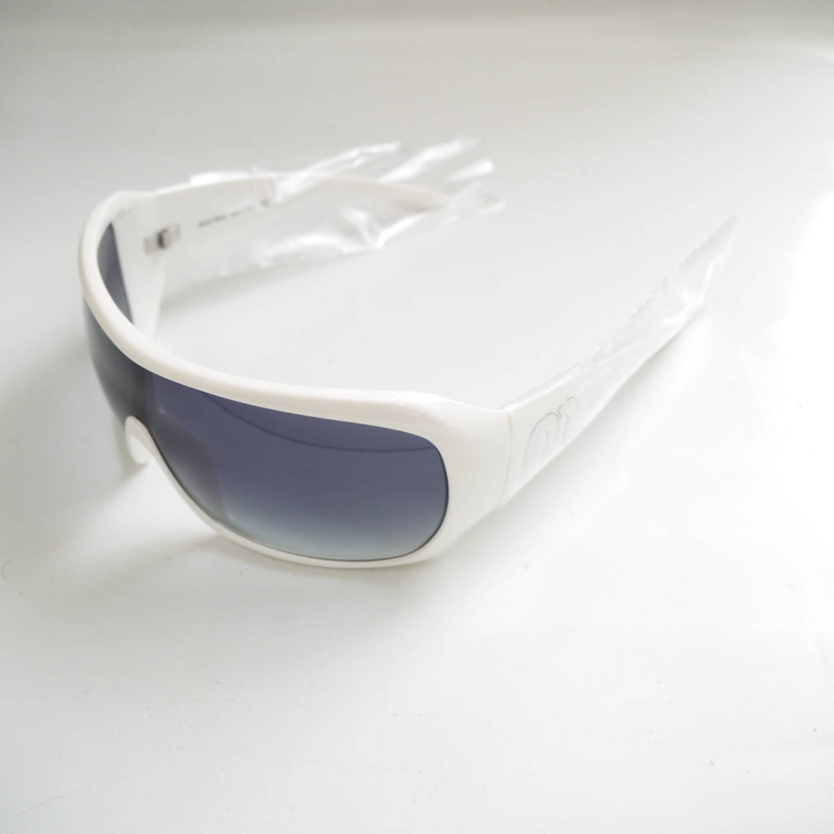 ■   miumiu   ■   ミュウミュウ   ■ 30101S101W          ホワイト系!  両サイドに ミラー調  m ロゴ入り!   レンズ色:グラデーション ブラック系!    眼鏡! サングラス!       イタリア製!           男女兼用も 可能です。