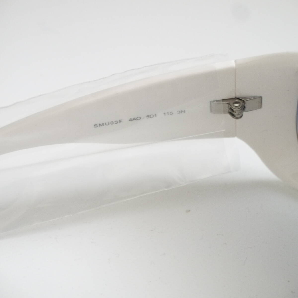 希少デザイン! イタリア製!          ミュウミュウ の   ホワイト系 大きめフレームに    両サイドの  ミラーの様な「    」 型 ロゴ & miumiu ロゴ入り デザインが  お洒落な♪      miumiu  イタリア製の   SMU03F  4AO-5D1  115  3N    眼鏡・サングラス になります。