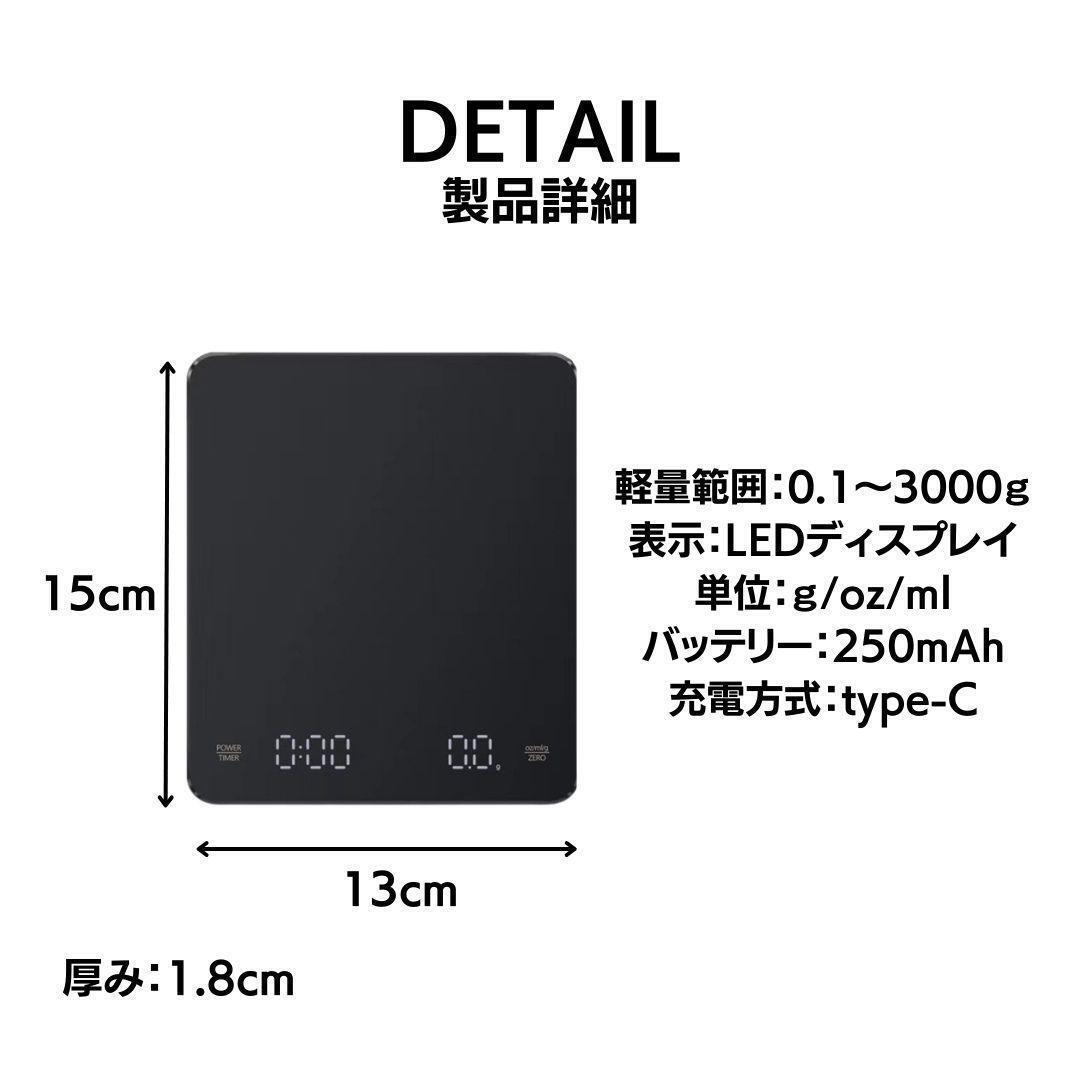 コーヒー用はもちろん、料理の調味料やお菓子作りにも幅広く使える多機能デジタルスケールです。はかりとタイマーが一体化したLEDディスプレイを搭載し、ハンドドリップの際にはお湯の量と投入タイミングを正確に管理できます。