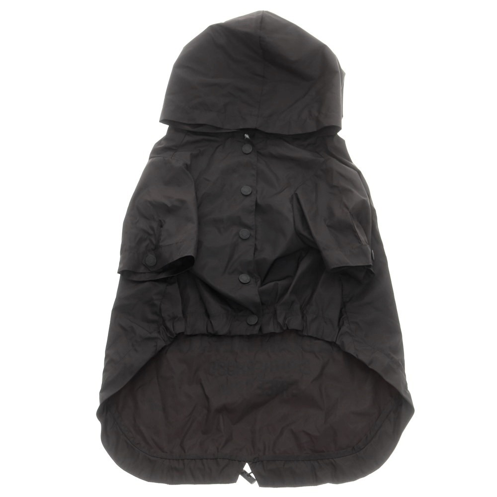 小型犬用のレインジャケットです。ブラック単色のシンプルなデザインに、ホワイトのブランドロゴが高級感ある一着です。