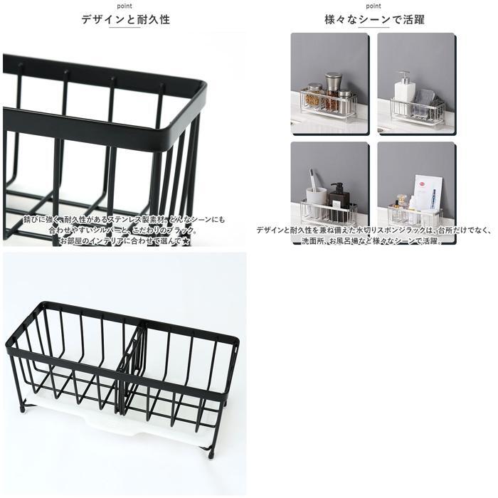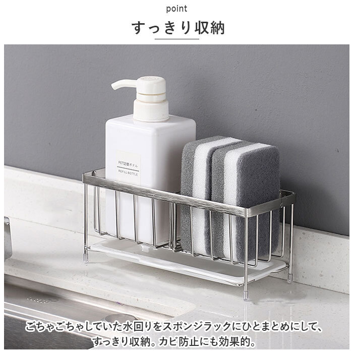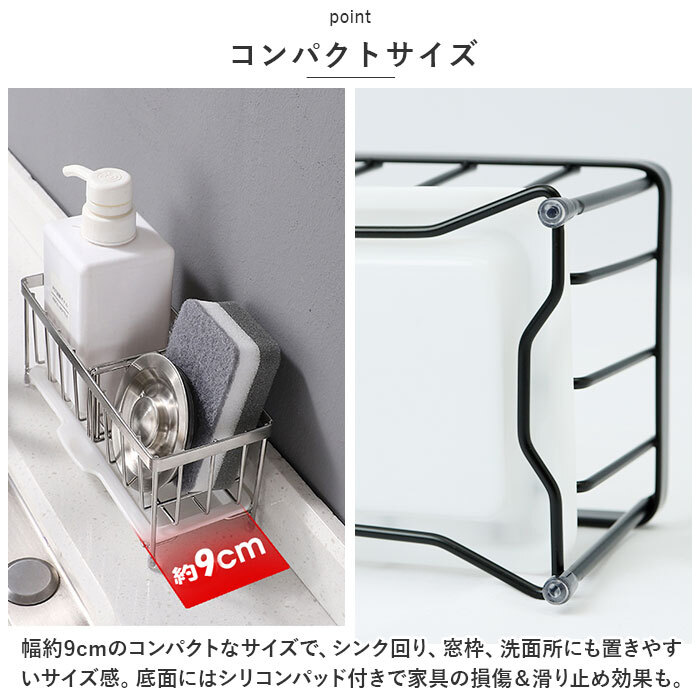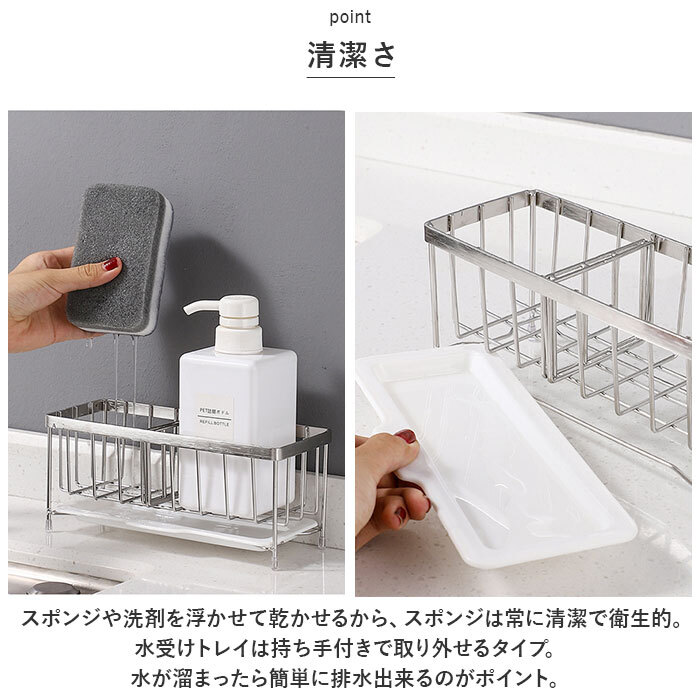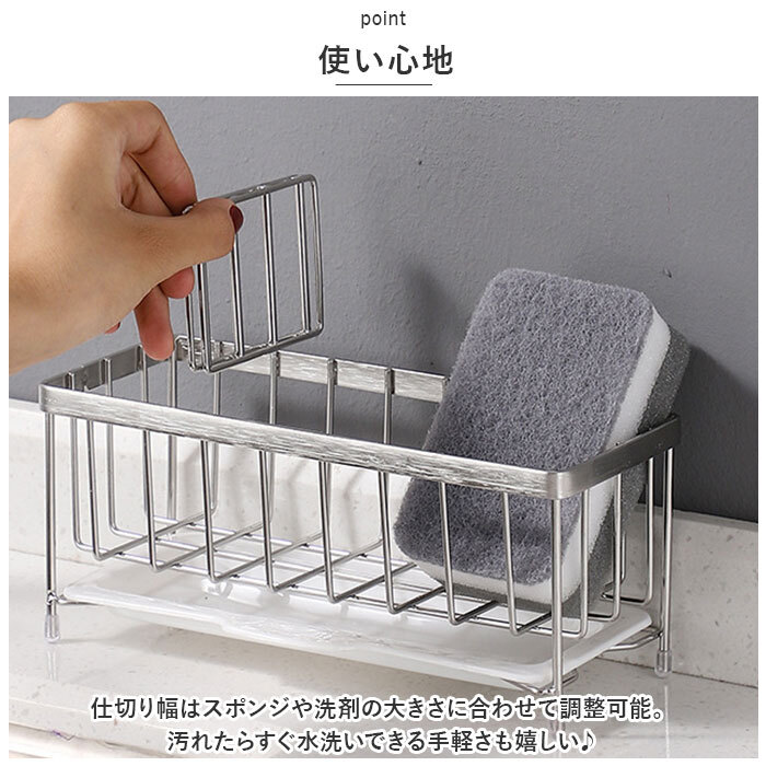 商品説明 | ・・スポンジや洗剤を浮かせて収納&乾燥できる「水切りスポンジラック」の登場。 ・【すっきり収納】 ・ごちゃごちゃしていた水回りをスポンジラックにひとまとめにして、すっきり収納。カビ防止にも効果的。 ・【清潔さ】 ・スポンジや洗剤を浮かせて乾かせるから、スポンジは常に清潔で衛生的。水受けトレイは持ち手付きで取り外せるタイプ。水が溜まったら簡単に排水出来るのがポイント。 ・【使い心地】 ・仕切り幅はスポンジや洗剤の大きさに合わせて調整可能。汚れたらすぐ水洗いできる手軽さも嬉しい♪ ・【コンパクトサイズ】 ・幅約9cmのコンパクトなサイズで、シンク回り、窓枠、洗面所にも置きやすいサイズ感。底面にはシリコンパッド付きで家具の損傷&滑り止め効果も。 ・【デザインと耐久性】 ・錆びに強く、耐久性があるステンレス製素材。どんなシーンにも合わせやすいシルバーと、こだわりのブラック。お部屋のインテリアに合わせて選んで★ ・【様々なシーンで活躍】 ・デザインと耐久性を兼ね備えた水切りスポンジラックは、台所だけでなく、洗面所、お風呂場など様々なシーンで活躍。 |