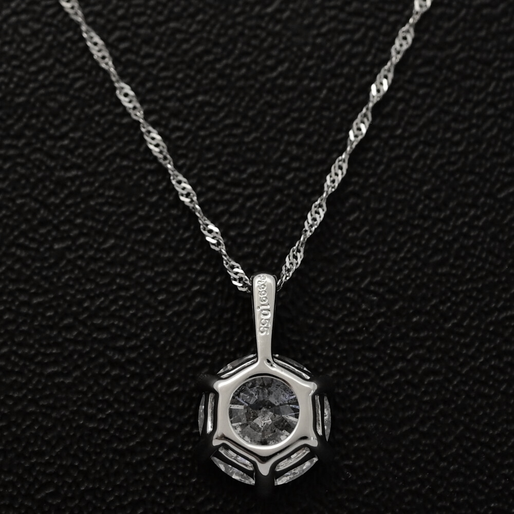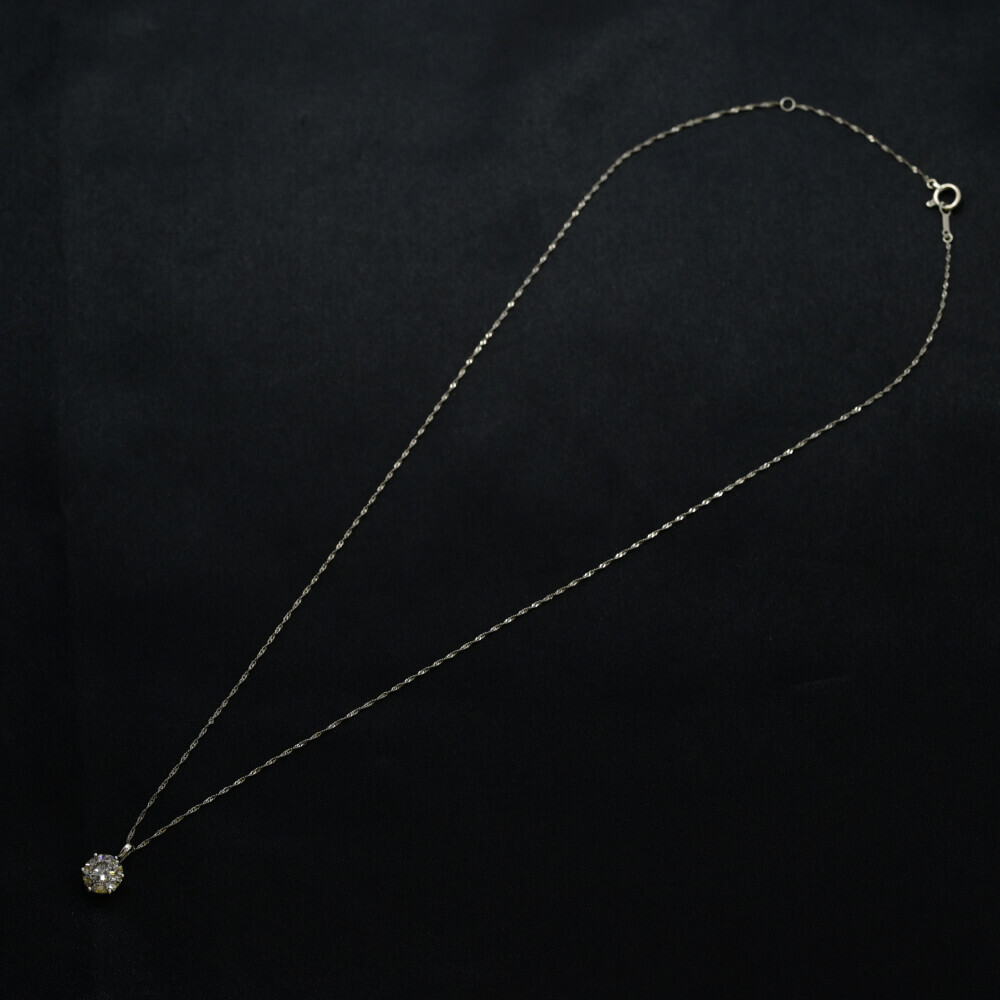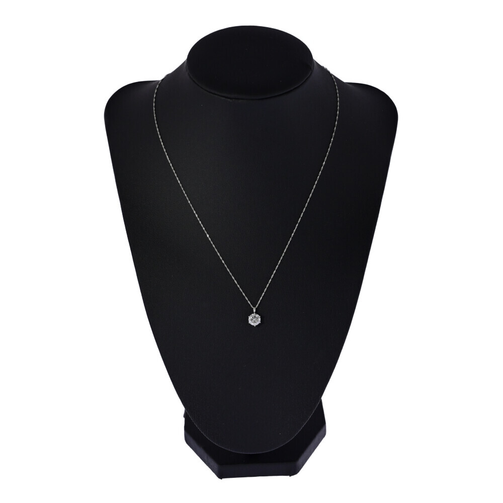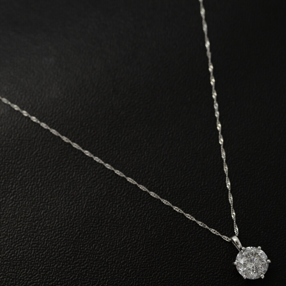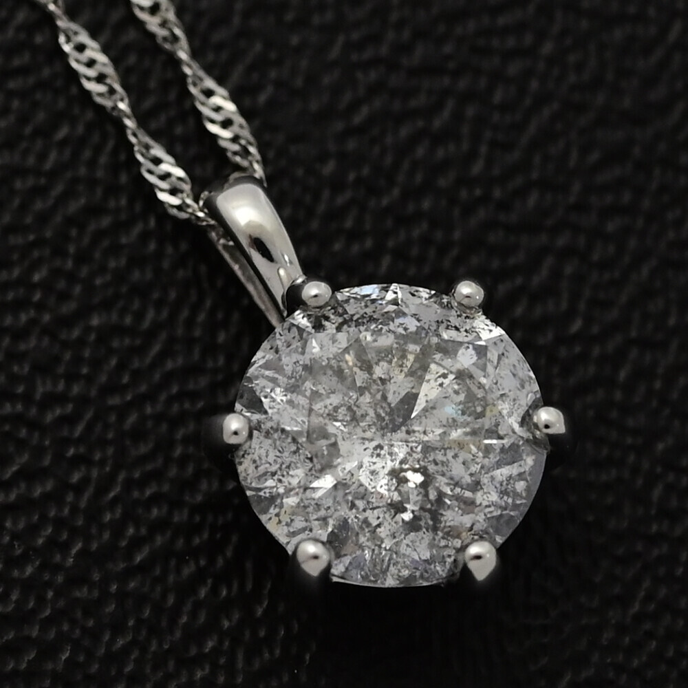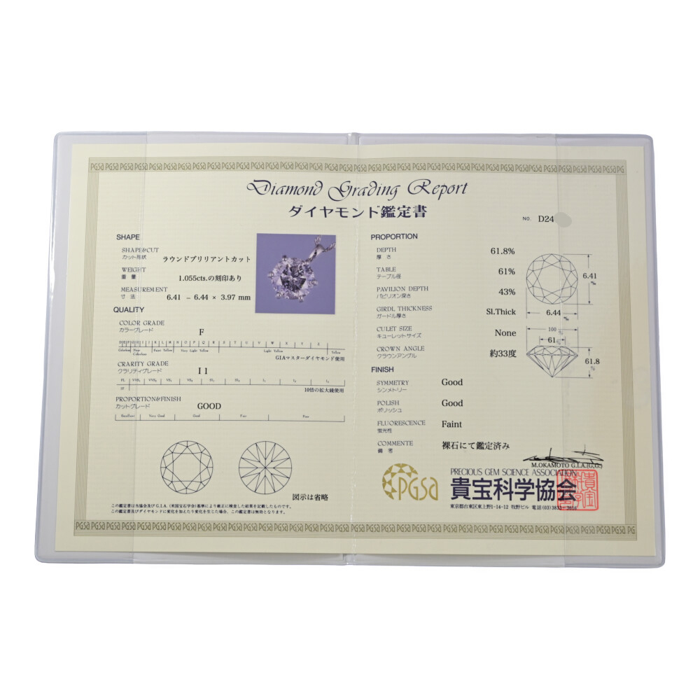 実寸サイズ | グラム:1.3g 親石:1.055ct シェイプ:ラウンド カッティングスタイル:ブリリアント セッティング:6本爪/ティファニーセッティング 処理:天然 鑑定機関:鑑別書(保証書)付 [サイズ(以下約)] 親石寸法(H×W 見え寸):6.41-6.44×3.97 mm カラー:F クラリティ:I1 カット:Good ポリッシュ:Good シンメトリー:Good 蛍光性:Faint Blue トップサイズ:H10.8 mm × W7.7 mm × D4.1 mm ※バチカン:含む バチカン内径:1.3×3.2 mm 着脱:可 チェーン全長:42.0 cm(トップを含まず) チェーン幅:0.5 mm ネックレス全長:22.0 cm アジャスター:無 |