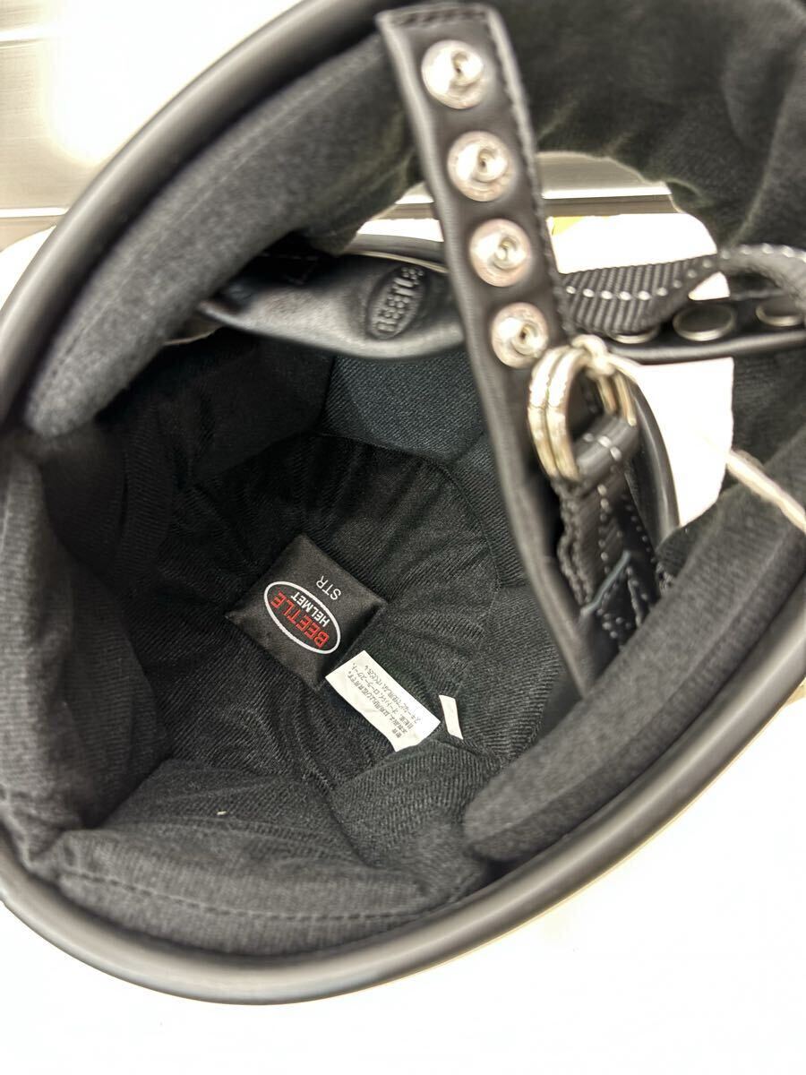 オールドヘルメットはダブルストラップの仕様が多く使われていて、金具、レザー部分がよりカッコ良さを引き立てます。