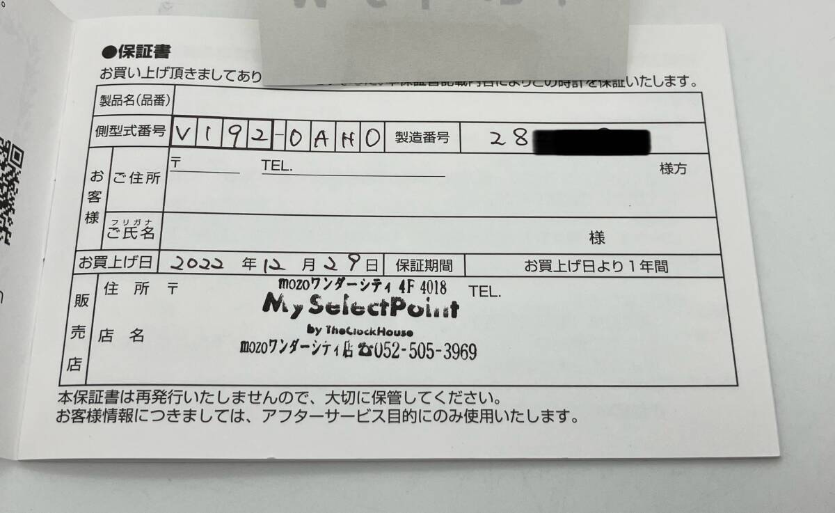 | 1万円以上3万円未満:3ヶ月間保証 3万円以上10万円未満:6ヶ月間保証 10万円以上:1年間保証 保証期間中の通常のご利用で、不具合や故障等が発生した場合、無料で修理・調整致します。保証書を添えて着払いでお送り下さい。 次のような場合、保証対象外となります。 ①本書のご提示がない場合。 ②本書のお買い上げ年月日の字句を書き換えられた場合。 ③使用上の誤り、他の機器から受けた障害、または不当な修理や改造による故障及び破損。 ④火災・地震・風災害・落雷・その他の天災による故障及び破損。 ⑤使用上における、ケース、ベルト、ガラス等の損傷。 ⑥落下、水入り(防水性の保証はしておりません)が原因の場合。 ⑦機械式時計のゼンマイ捲き切り。 |