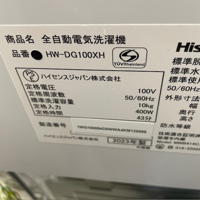 Hisense ハイセンス 2023年製 10.0kg 全自動電気洗濯機 HW-DG100XH S/N:20095 埼玉県鴻巣市 手渡し限定 【埼玉県】 |