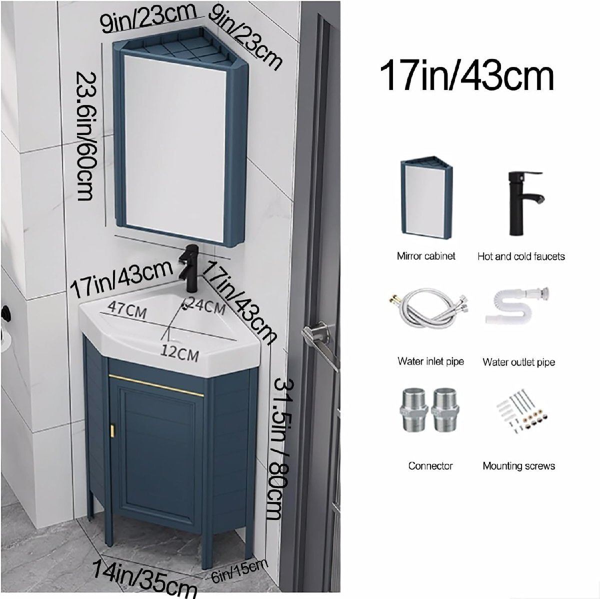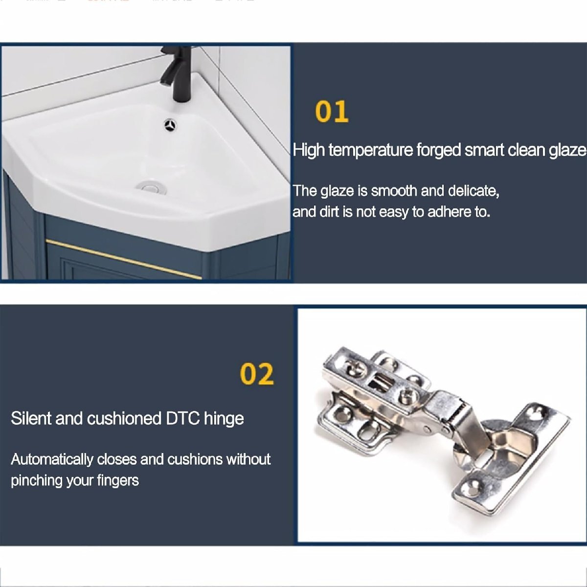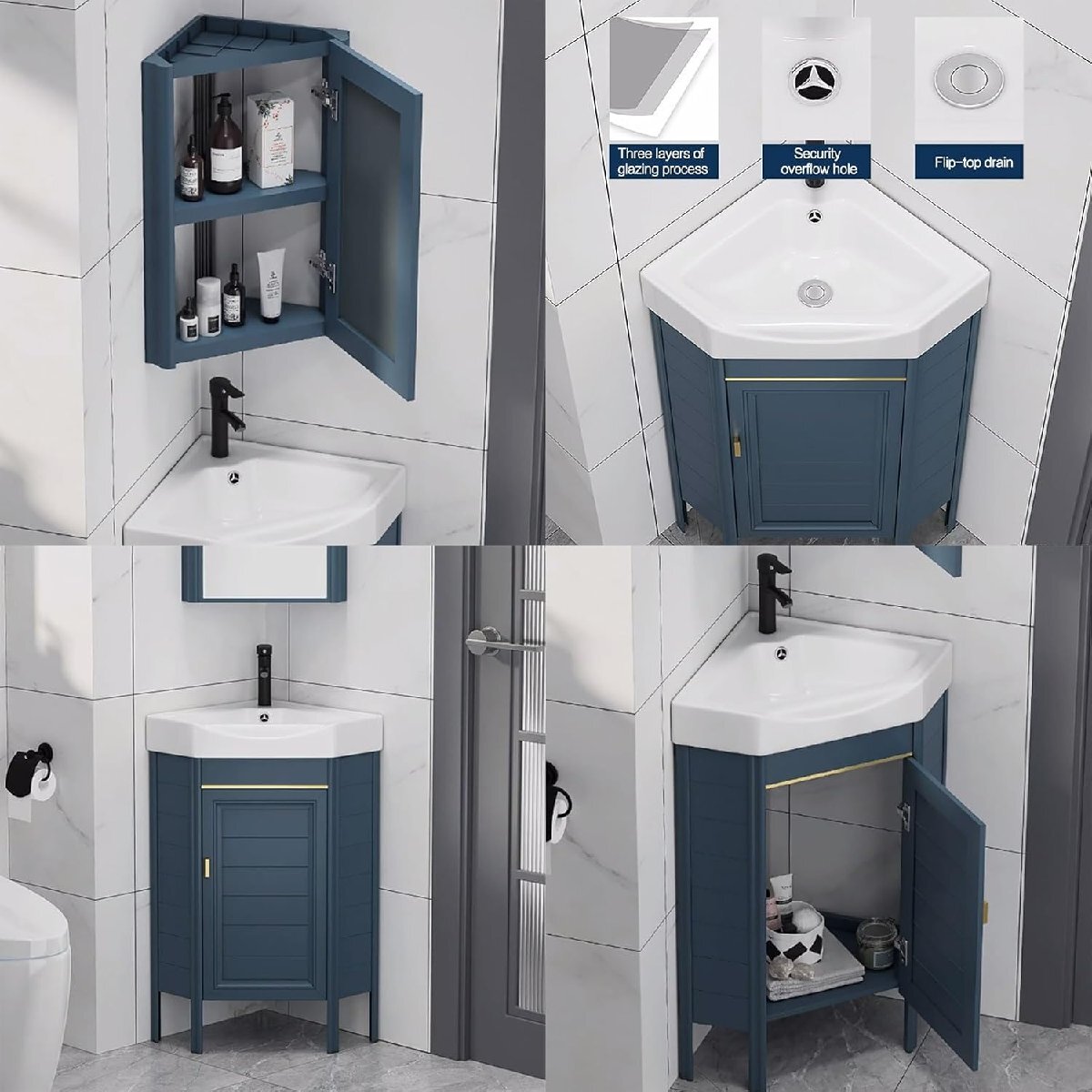 コーナーシンクはどのコーナーにも簡単に取り付けられ、多用途でさまざまなバスルームのレイアウトやサイズに適応できます。