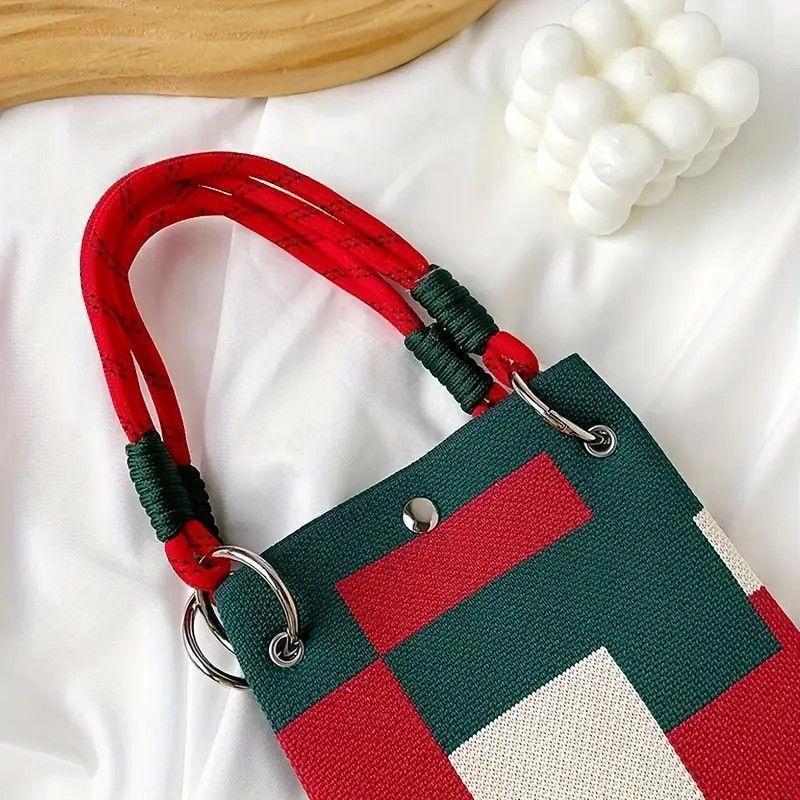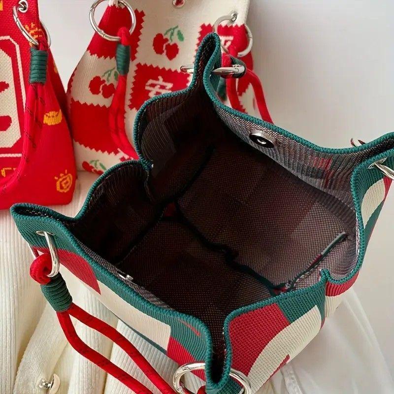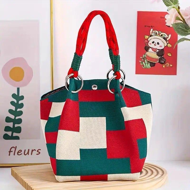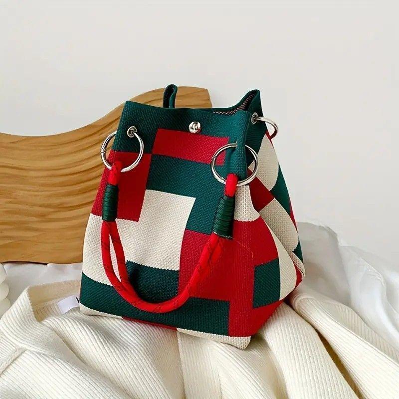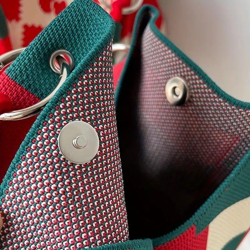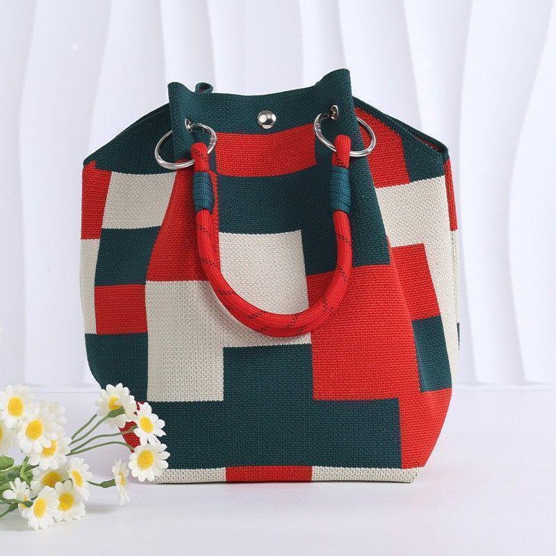 カジュアルにもフォーマルにも合わせやすい、ニット素材のスクエアパターントートバッグです。