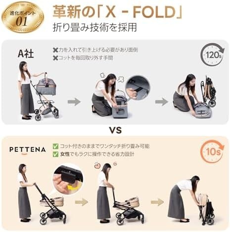 • ???【最新Xのワンタッチ折り畳み技術】PETTENA ORIONペットカートは、従来の煩雑な折り畳み操作を革新した「X-FOLD」技術を搭載。ボタンひとつで、キャリーコット単体はわずか3秒で折り畳み可能。フレームからコットを取り外す必要もなく、折り畳んだ状態で自立収納ができるため、移動先でも収納場所に困りません。従来のペットカートは、折り畳みに5ステップ・約1分を要しましたが、ORIONはわずか2ステップ・約5秒で簡単に折り畳み・展開が完了。手間なく快適にお出かけできます。