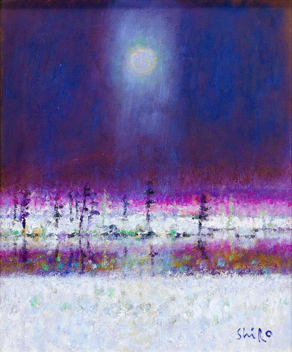 和気史郎(1925年栃木県生まれ~1988年没)は、東京芸術大学油画科で安井曽太郎に学び、独立美術協会の会員として活動した洋画家である。1957年に独立賞を受賞、翌年には同賞を再受賞し、1959年に会員推挙を受けた。戦争体験と結核の影響から「虚無」や「無常観」を強く意識するようになり、やがて能との出会いを契機に能面や能舞台などを主題とした幻想的な作品を多く描くようになる。写実に基づきつつも、滅びゆく古寺や能の妖しさを通して幽玄の世界を表現し、特に「正気と狂気」の境を漂うような精神性と詩情に満ちた独特の画風で知られる。大阪にアトリエを構え、生涯を通じて能と苔寺の世界を描き続けた。1988年、62歳で逝去。