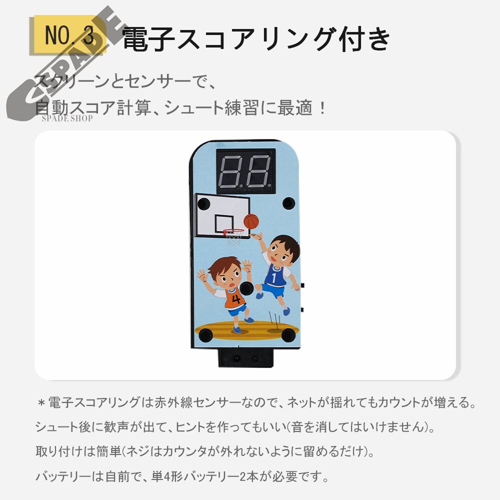 • 【電子スコアリング付き】スクリーンとセンサーで、 自動スコア計算、シュート練習に最適!*電子スコアリングは赤外線センサーなので、ネットが揺れてもカウントが増える。 シュート後に歓声が出て、ヒントを作ってもいい(音を消してはいけません)。 取り付けは簡単(ネジはカウンタが外れないように留めるだけ)。 バッテリーは自前で、単四形バッテリー2本が必要です。