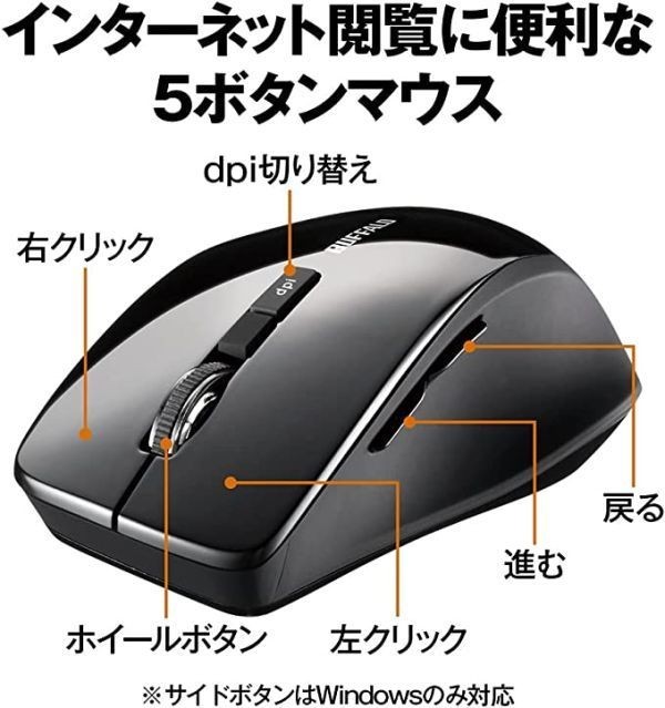 【大幅値下げ】バッファロー マウス 無線 ワイヤレス 静音 5ボタン 【戻る/進むボタン搭載】dpi切替 BlueLED ブラック BSMBW325BK