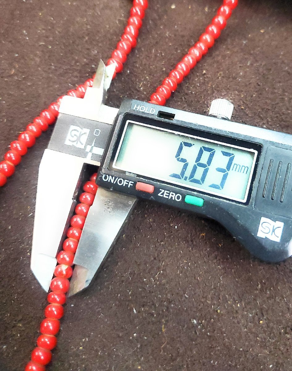 サイズ:1連の長さ約64cm。1粒の大きさ直径約5・8mm前後×暑さ約4mm前後×穴約1.2mm前後。