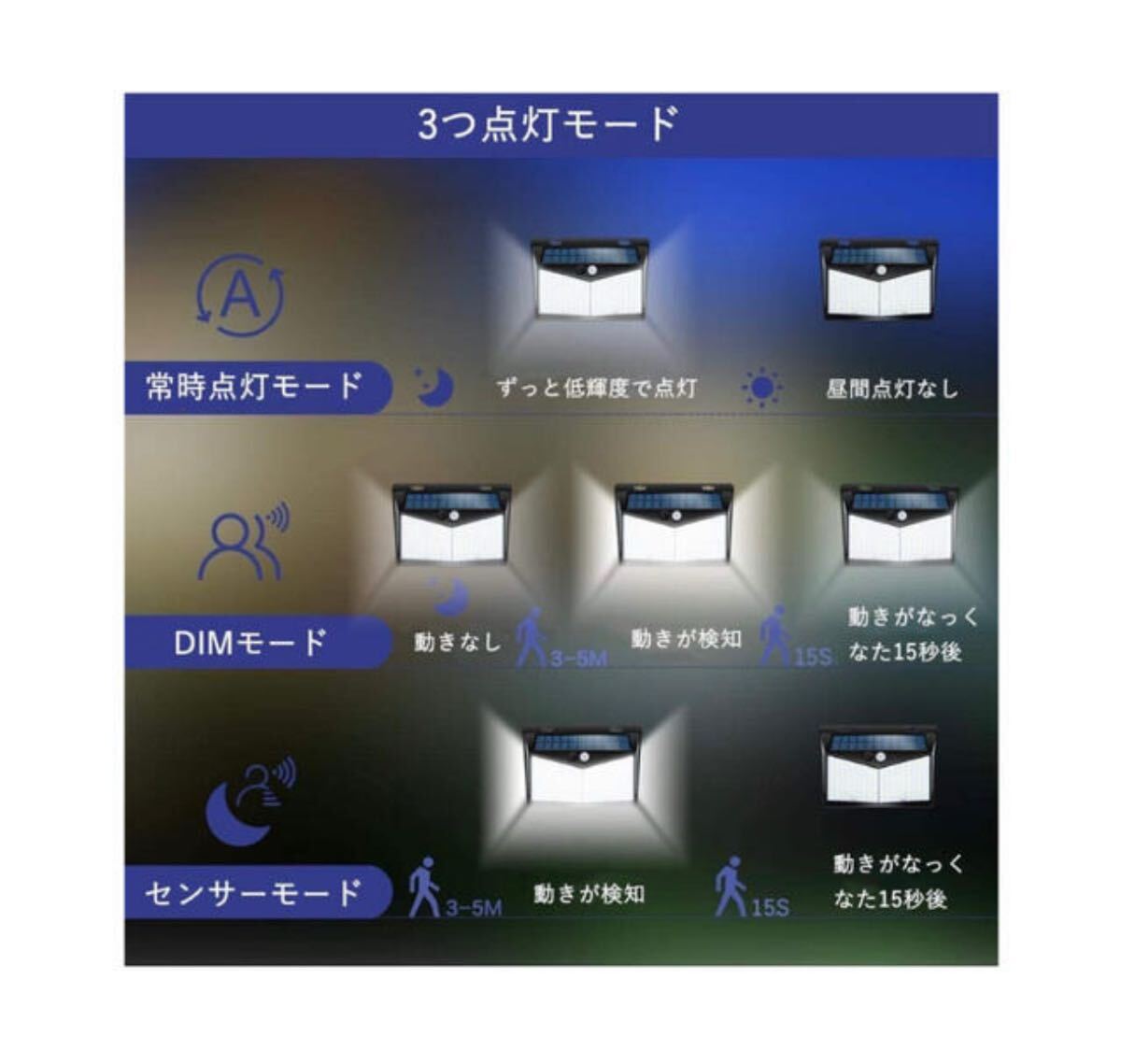 【3つの点灯モード・光&人感センサーライト】常時点灯モード、DIMモード、自動点灯センサーモード三つの知能モードが搭載されています。場合によって異なるモードを設定できます。人の動きを検知して自動的に点灯するセンサーモードを一番お勧めです。動きがないとき、点灯しない、動きを感知されると、点灯して、15秒のあと、自動消灯します。(3つのモードとも昼間と明るい場所では点灯しません。)