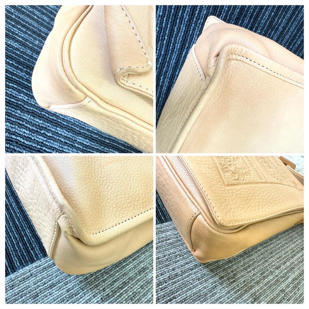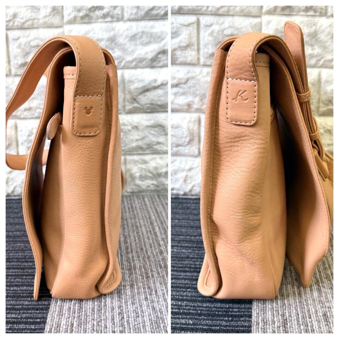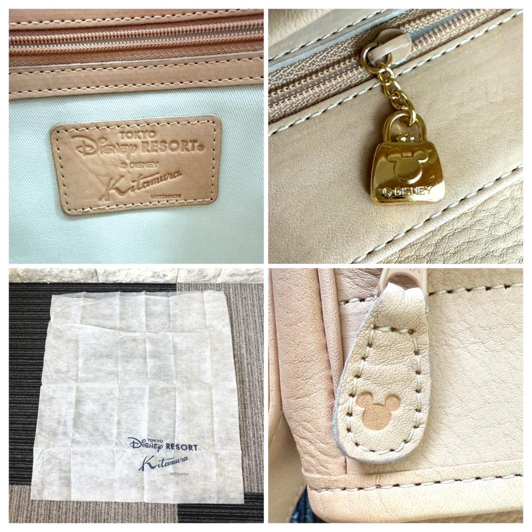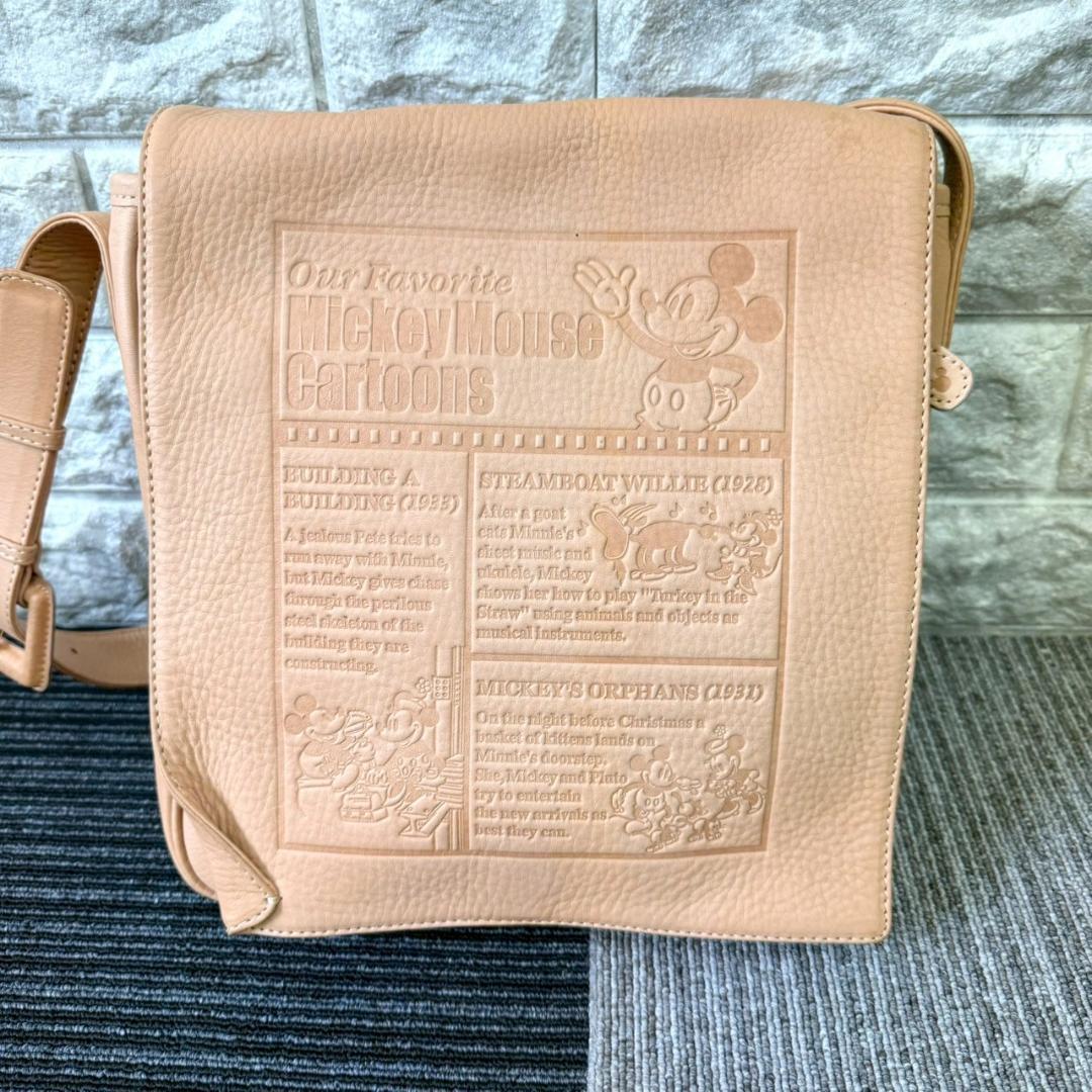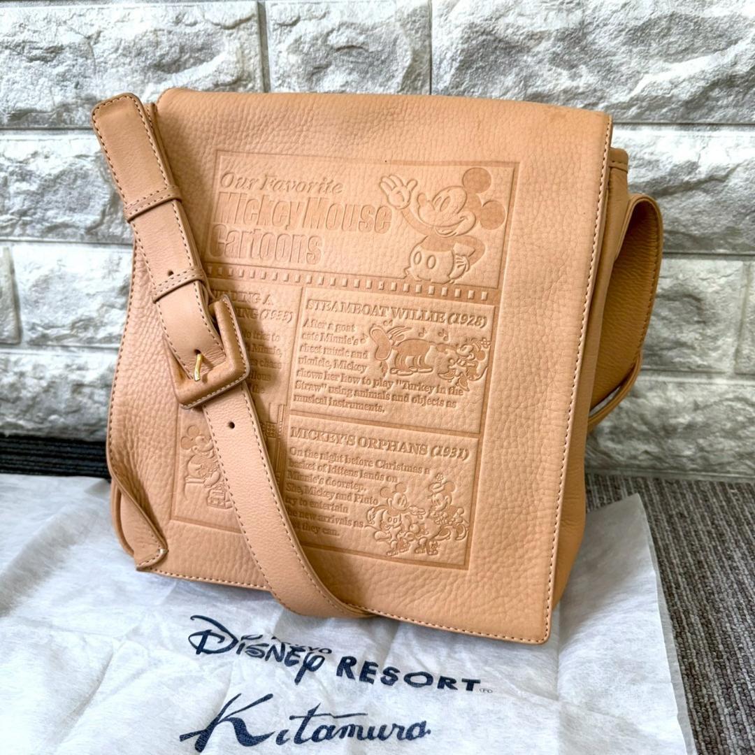 ディズニーリゾート限定、キタムラとのコラボショルダーバッグです。上質なベージュレザーにミッキーマウスのクラシックカートゥーンデザインを型押しした遊び心あるデザイン。A4対応サイズで収納力もあり、普段使いからお出かけまで幅広く活躍します。