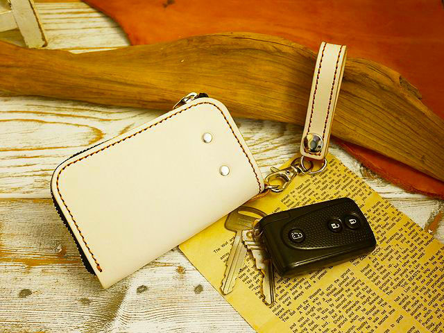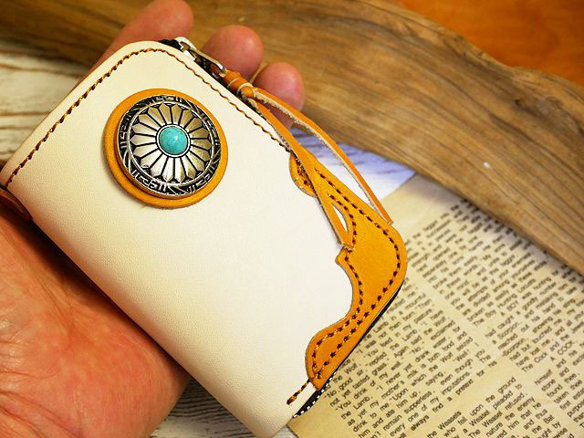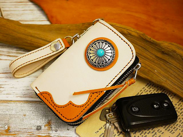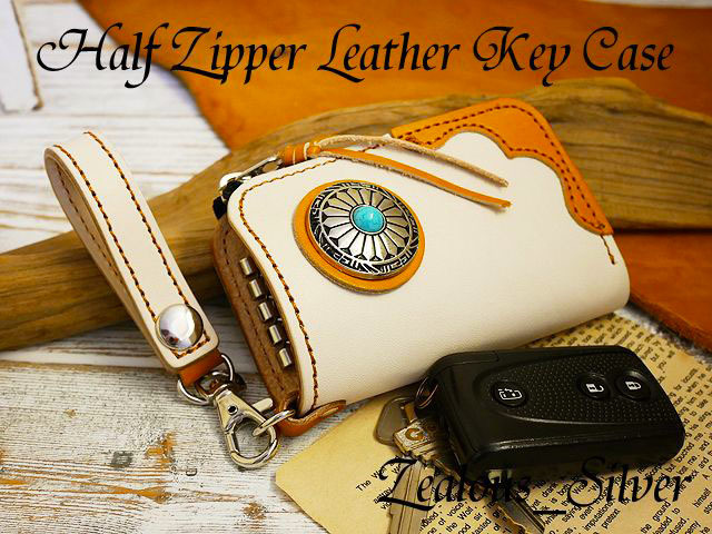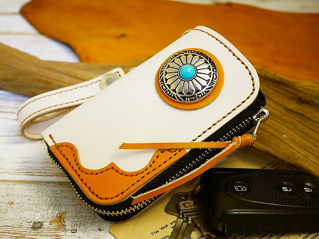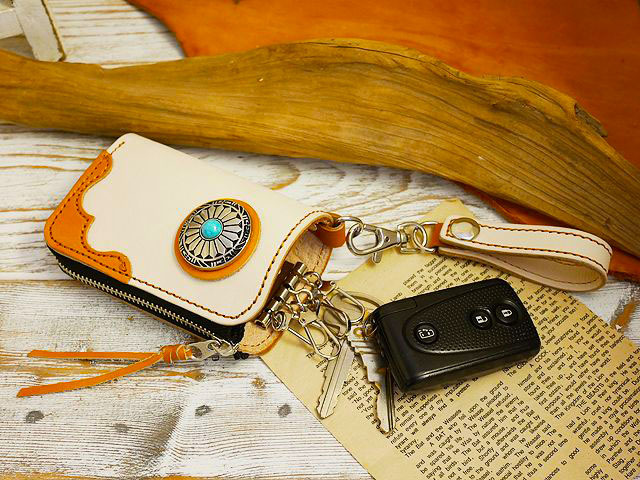 コロンとフォルム!!ハーフジッパー レザーキーケース ハンドメイド 姫路レザー ターコイズコンチョ スマートキ- キーホルダーSET