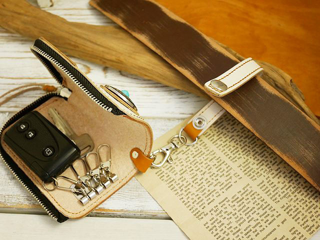 コロンとフォルム!!ハーフジッパー レザーキーケース ターコイズコンチョ スマートキー タンロー×キャメルパーツステッチ キーホルダーset