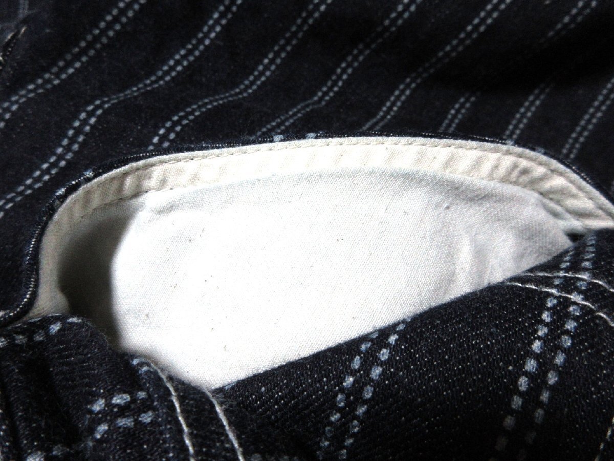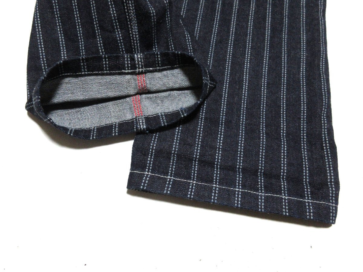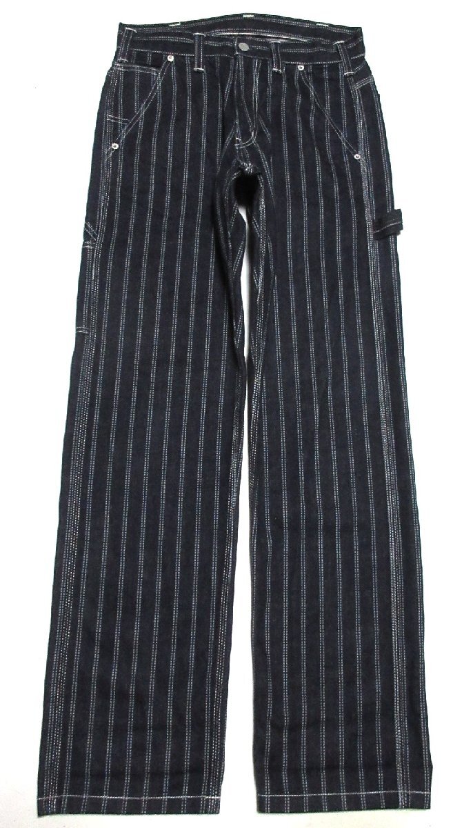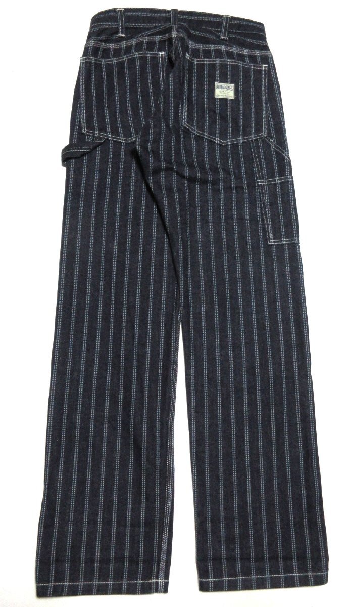 | ●素材:綿100% ●カラー:インディゴ/ウォバッシュ ●サイズ表記 W30 *実寸(約㎝)ウエスト 80・股上前 31後ろ 42・股下 85・ 裾幅 22・渡り幅 31 (ウエストはトップボタン裏中心から内周を測っています。若干の誤差はご容赦下さい) 濃いめのデニムに2本の縦じまが入ったダブルストライプ仕様のウォバッシュ生地を使用したペインターパンツ。ハンマーループ、スケールポケットをそなえたベーシックなペインター仕様となっています。日本製。