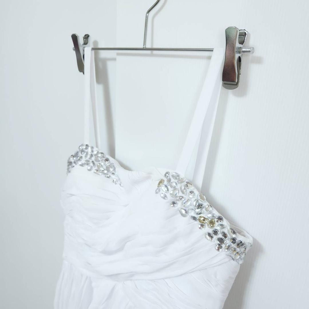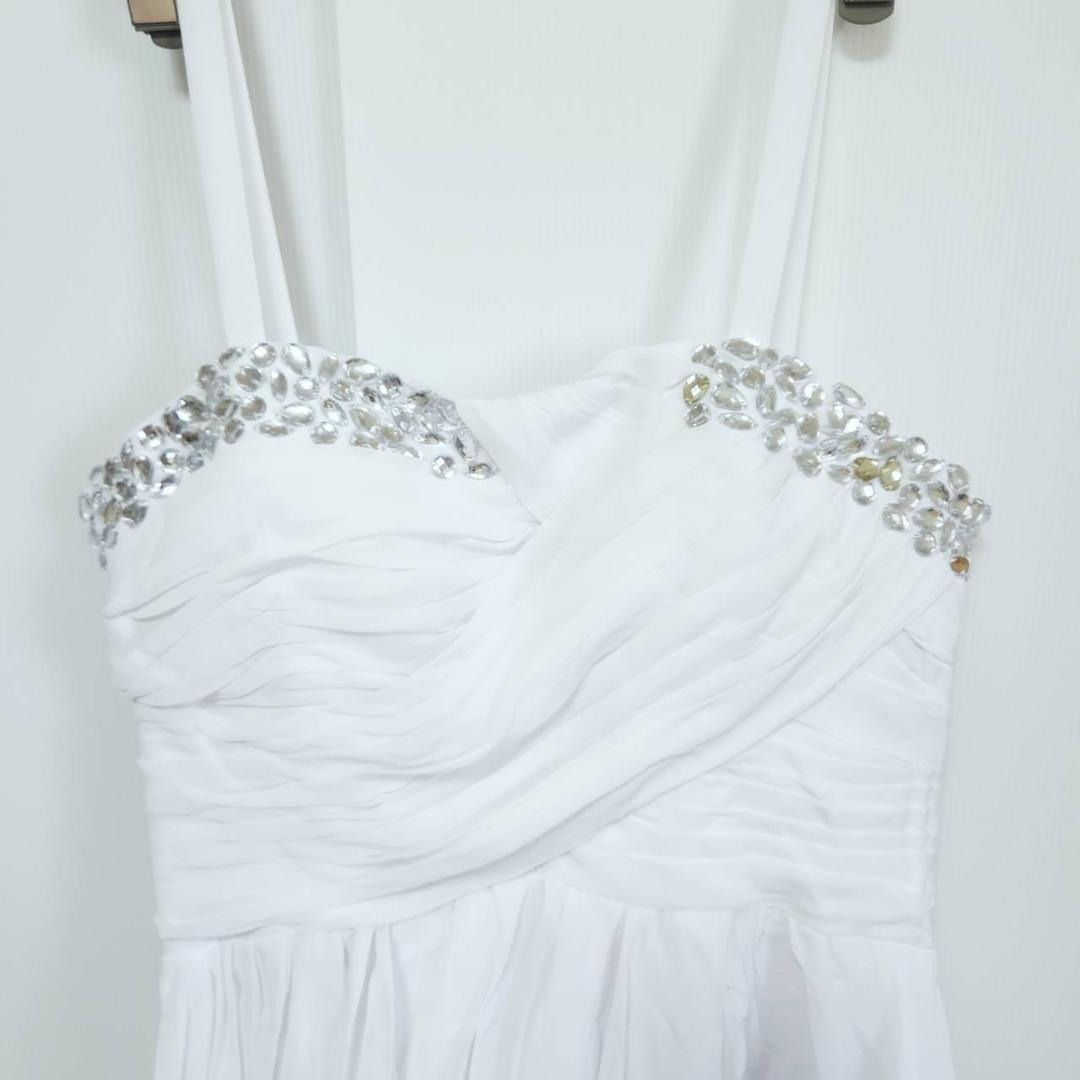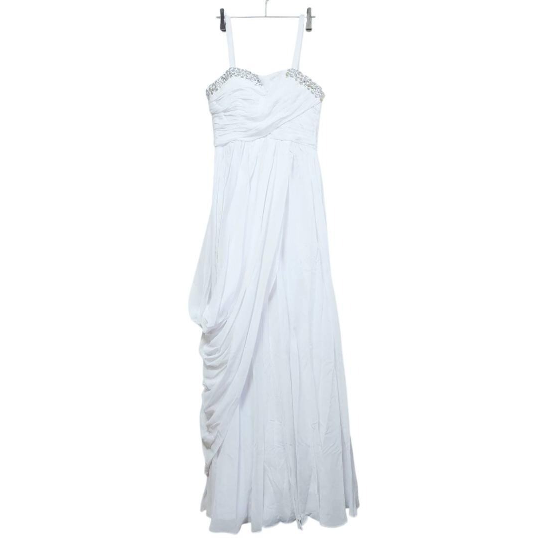 ホワイトカラーのロングドレスです。胸元にビジュー装飾が施されており、華やかな印象を与えてくれます。