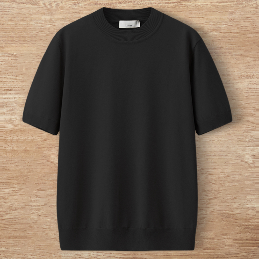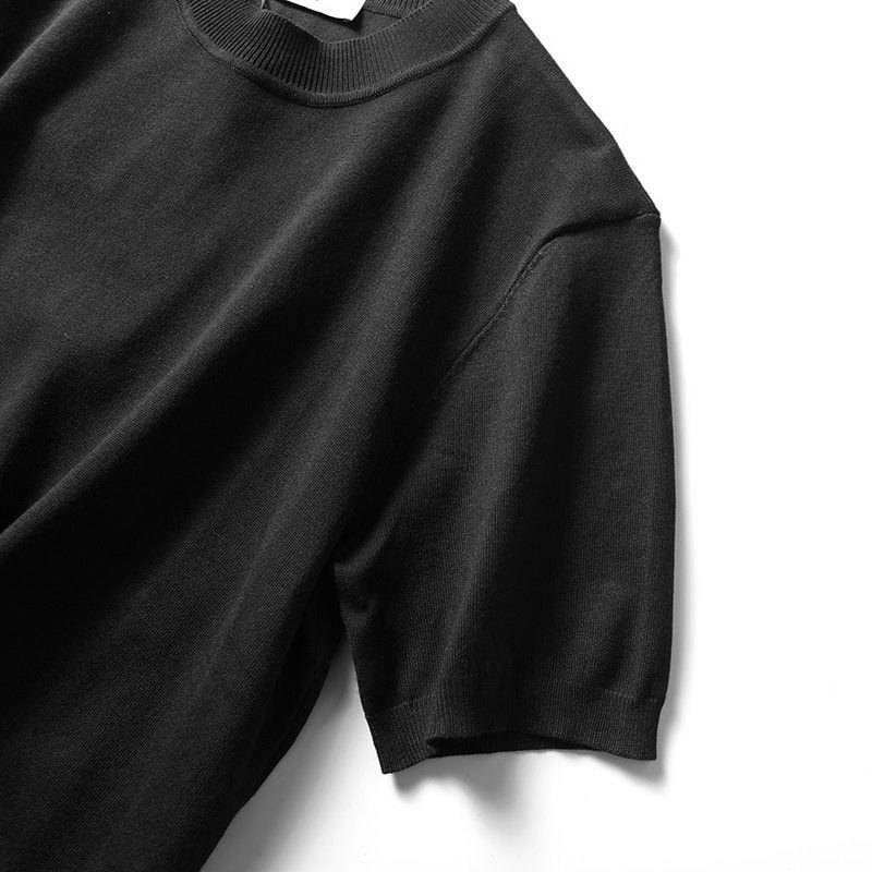 W1732-XL 新品 テンセル混 サマー ニット 接触冷感 柔らかい 伸縮性 半袖 Tシャツ メンズ プルオーバー 春夏 盛夏 丸首 クルーネック ハイゲージ カットソー ブラック