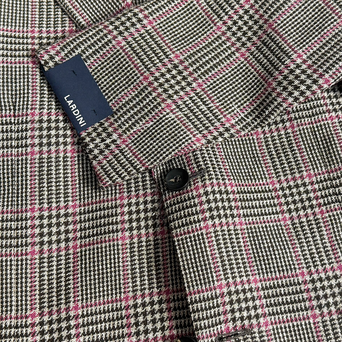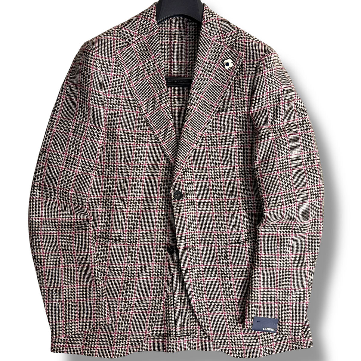 商品について:定価129,800円。LARDINIのエクスクルーシブ生地を採用した1着。ウール、リネン、シルクの混紡。それぞれの表情、特徴をうま~く掛け合わせたことでうまれる風合い豊かな生地感に仕上がっています。そんな生地にブラウンのグレンチェックをのせ、さらにパープル系のピンクのペンをプラス!オトナの渋さにほんのりと色気を感じさせる柄です。一見派手に感じそうな柄も、品よくまとまっています◎これがLARDINIのなせるワザなんです!シルエットももちろん文句なしの仕上がり。着る人の事を考え、美しく、バランスよく見える様に計算されています。そして今回はワイドラペル仕様。定番の3釦段返りジャケットよりもすこーし幅広!襟周りは少しの差でも印象がガラリと変わるので、重要な部分のひとつ。ワイドラペルになることで、存在感と風格が漂います♪いつものジャケットと雰囲気を変えたいならこのジャケットがおすすめです