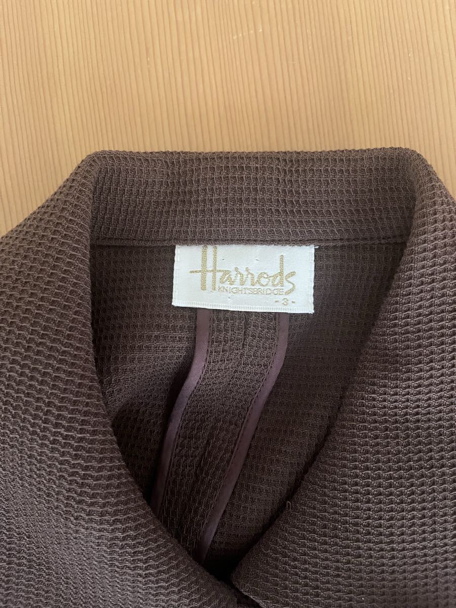 Harrods のスーツです。18年前子供の小学校受験のために購入したものなので、1回着用しました。その後クリーニングに出して18年間タンスにしまい込んでいるので古いものですが状態はいいほうだと思います。購入時の価格は忘れましたが多分15万円くらいだったと思います。