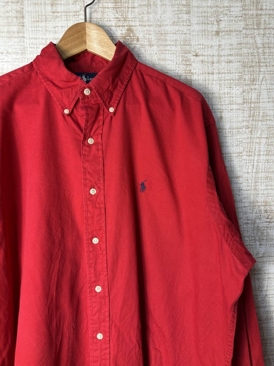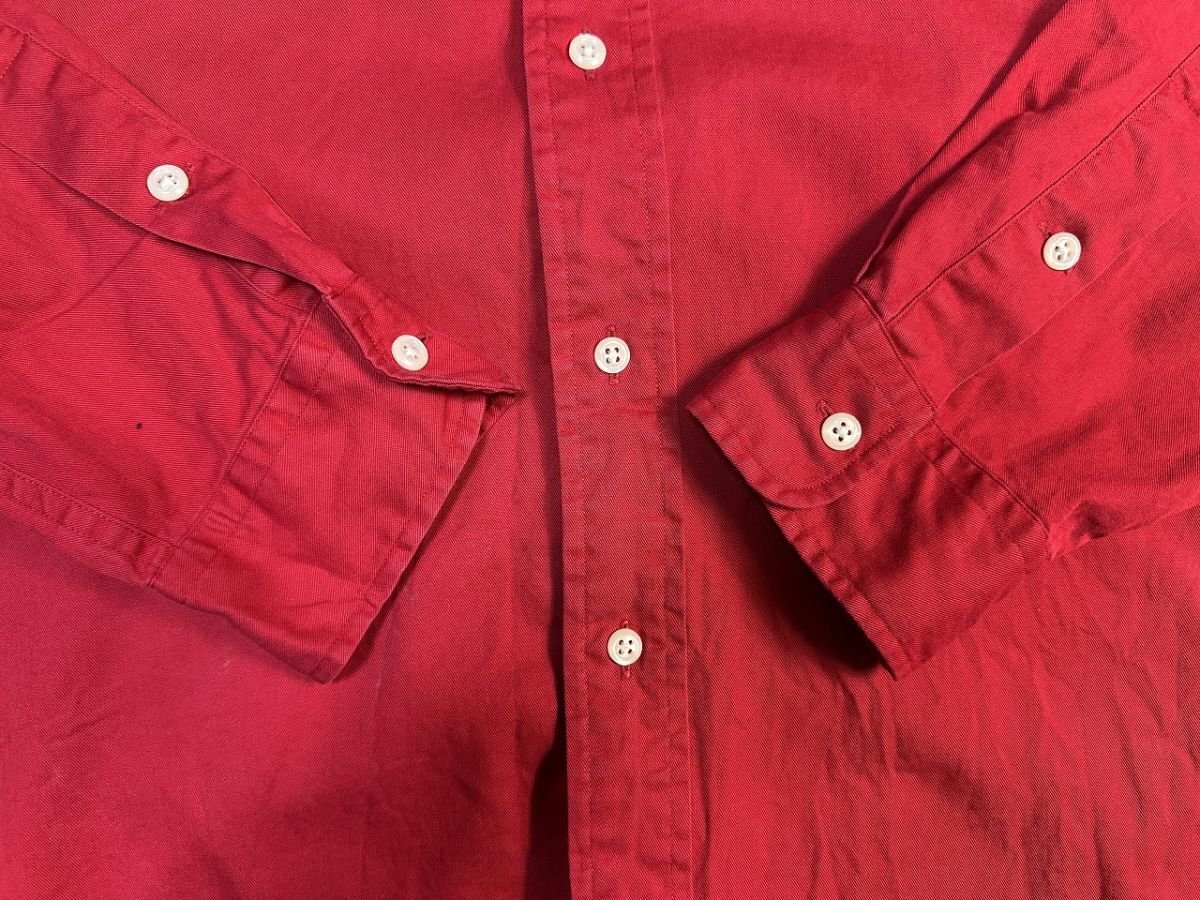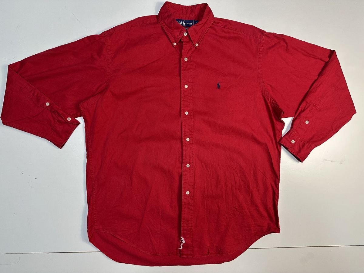 ●US USED ダメージありUS古着 Ralph Lauren ラルフローレン 綿シャツ ロゴ刺繍 長袖シャツ レッド赤【L】コットン