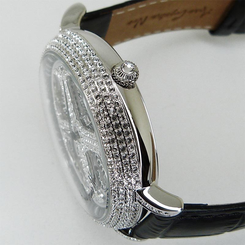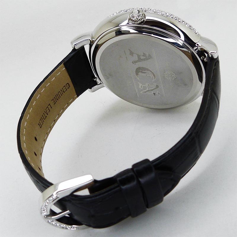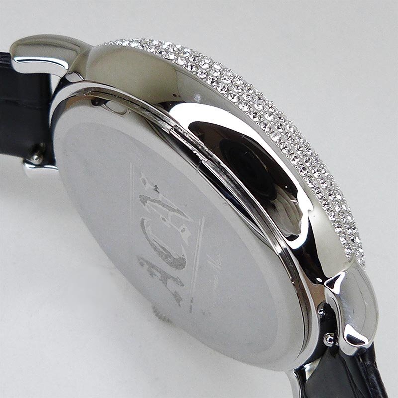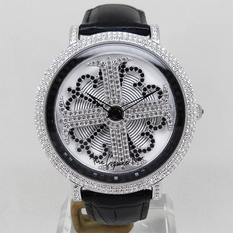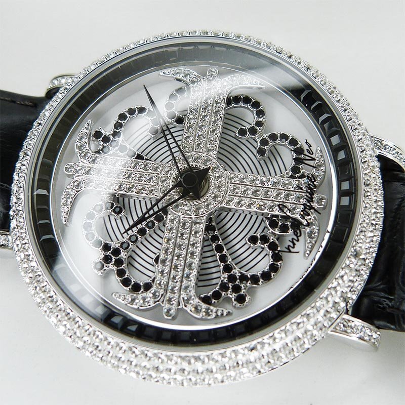 未使用展示商品でしたが、付属品の欠品と小傷、擦り傷、線傷・打ち傷痕がございますため、中古品として掲載いたします。クロスデザインとサークルデザインが2段交互に回るデザイン大きな文字盤とともに贅沢に煌めくスワロフスキーフレームが特徴的な時計です。