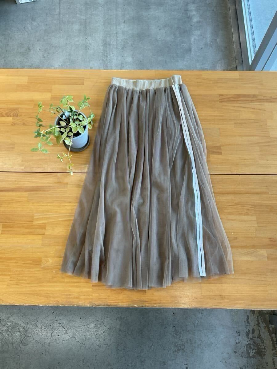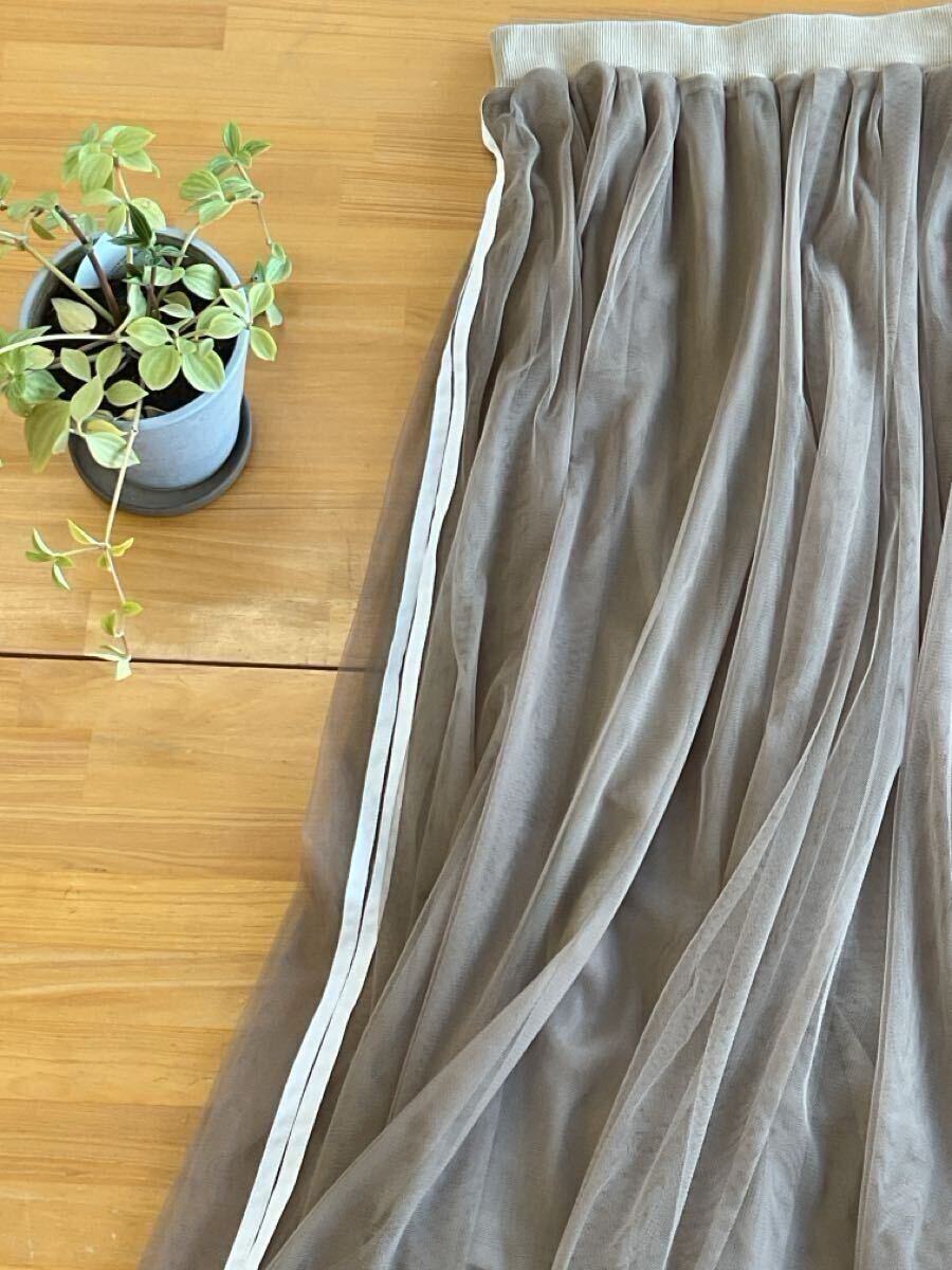 MyLanka ミランカ サイドラインチュールフレアロングスカート ウエストゴム シアーレイヤードAラインボトムス カーキベージュ色系 M h