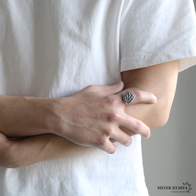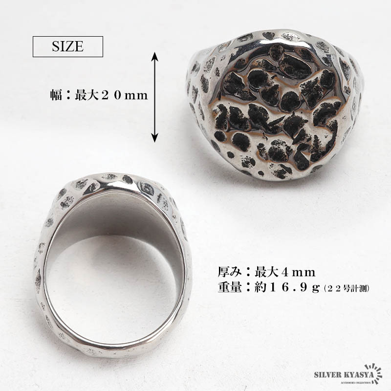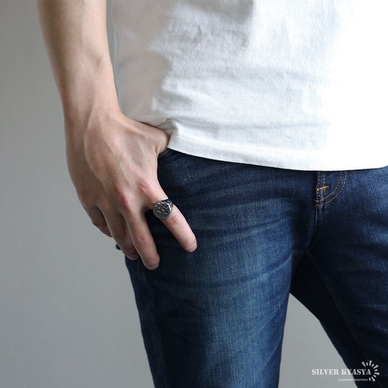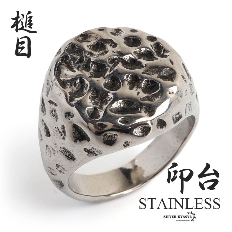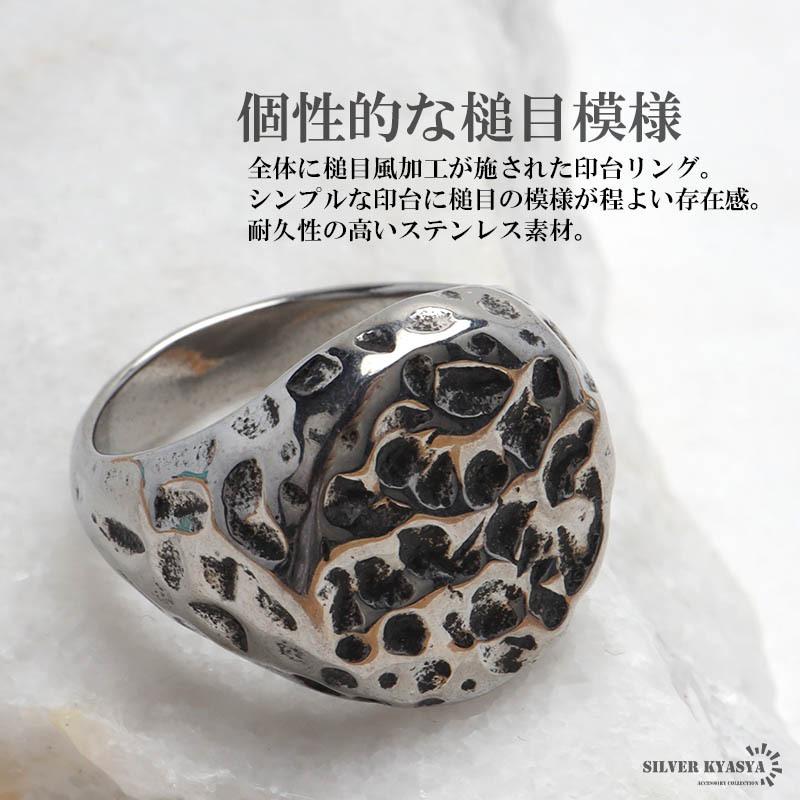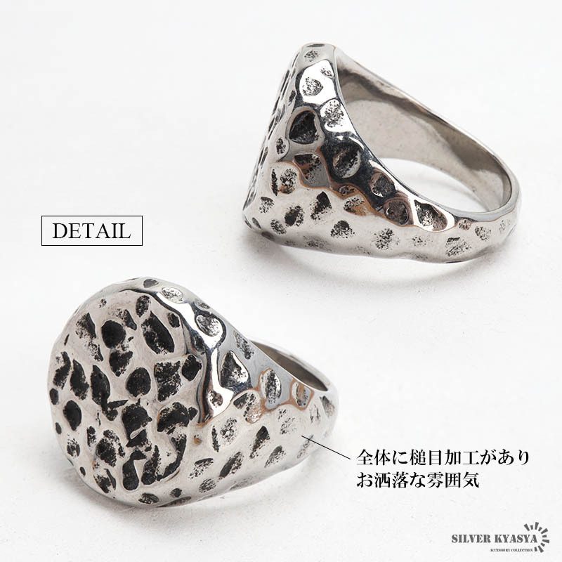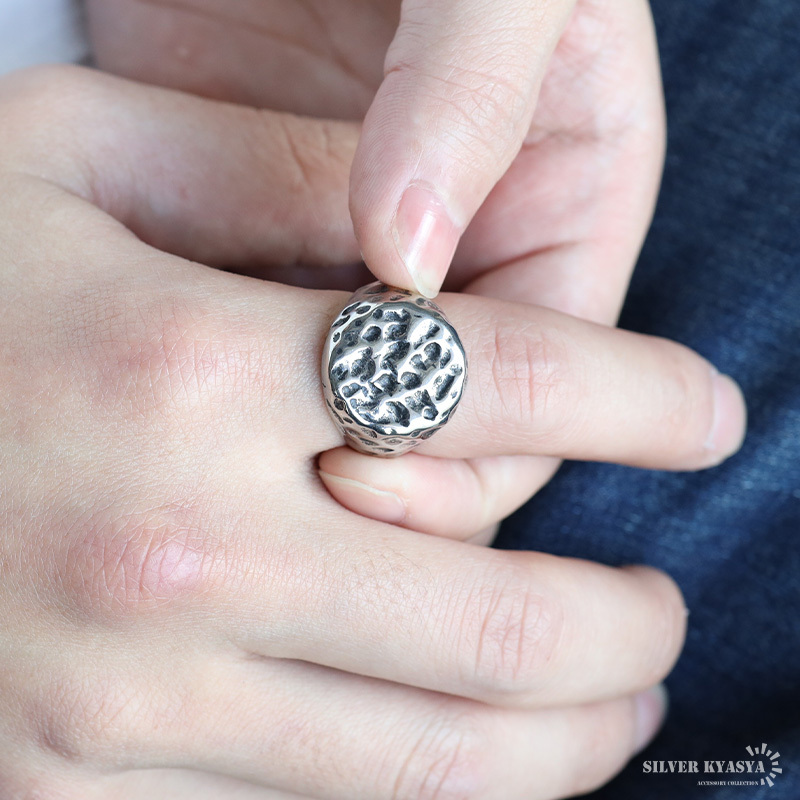 | 商品概要 | ■個性的な槌目模様 全体に槌目風加工が施された印台リング。シンプルな印台に槌目の模様が程よい存在感。耐久性の高いステンレス素材。 ■ステンレス素材を使用 金属部分は頑丈なことで知られるステンレス素材を採用。耐久性はもちろん耐水性も高く水場での着用も可能。金属アレルギーも出にくいとされている金属です。 |