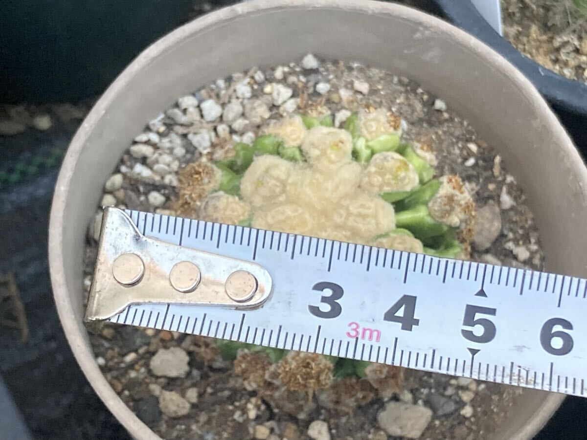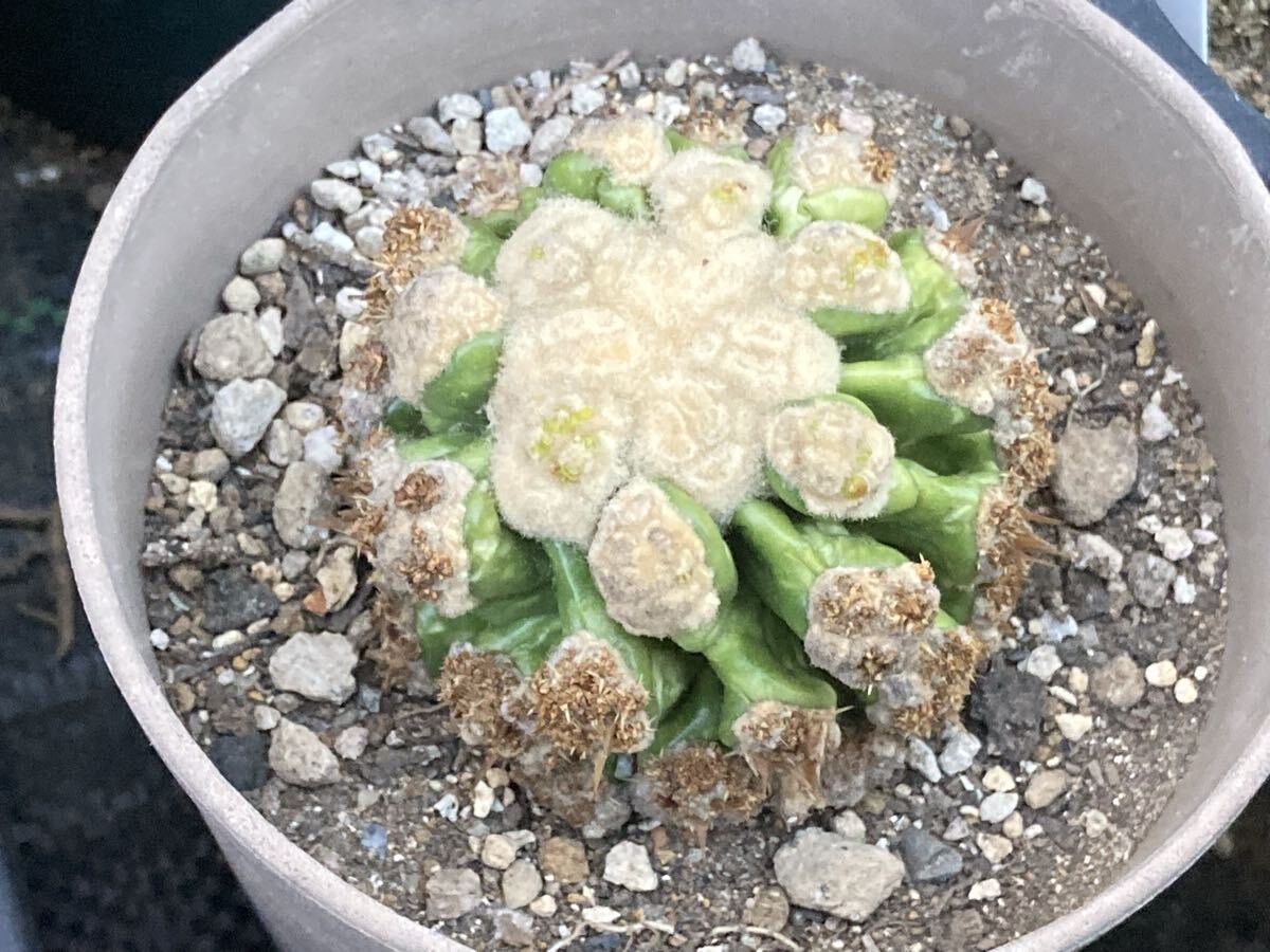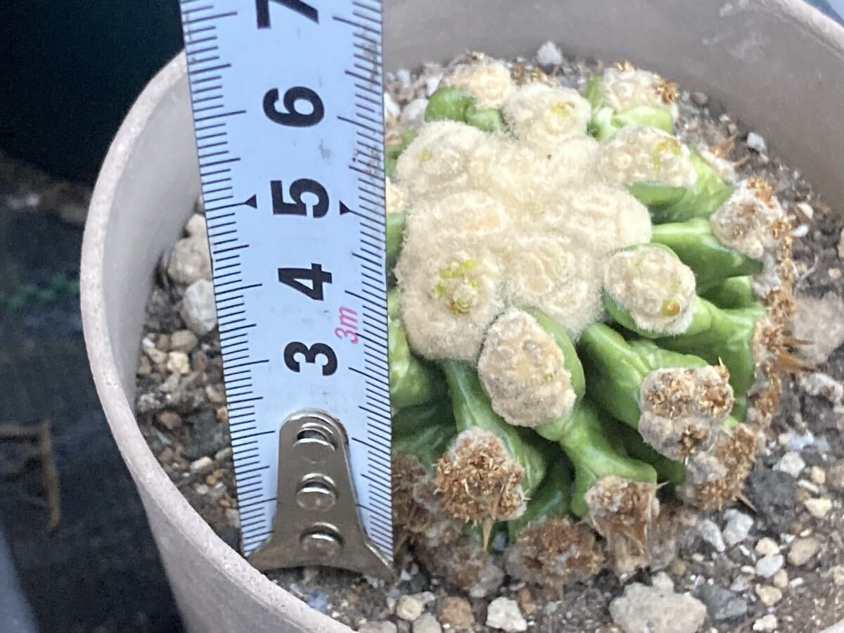 開花まで50〜60年はかかる超大型サボテンの珍しいモンスト種。刺無しタイプで、綿がふさふさした可愛い風貌の個体です。