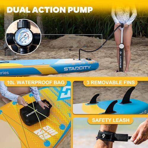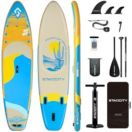 【独占的なアクセサリーと品質保証】スターシティのパドルボードセットは、エアー式パドルボード、エアポンプ、3つに分解可能な浮きパドル(水中で浮く特殊素材で作られ、様々な水中環境に適している)、セーフティーリーシュ、防水フォンポーチ、持ち運び用リュックサック、取り外し可能な3枚のフィン、およびすべての必要なアクセサリーが含まれています。