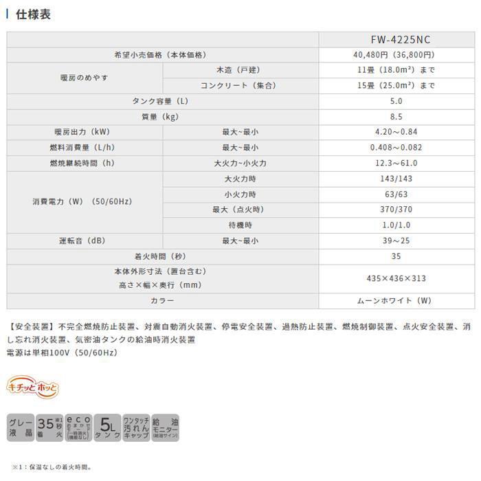 | ■□商品特長□■ | ◎スピード着火(35秒)⇒運転開始後、冷えきったお部屋をすばやく暖めます。 ◎パワフル秒速消臭システム(特許取得)⇒消火時のニオイをしっかり燃やしきるシステムで、嫌なニオイが少なく快適です。 ◎ワンタッチ汚れんキャップ ⇒ワンタッチで簡単にキャップの開け閉めができます。 ◎給油2段階サイン(給油モニター付き)⇒タンクが空になると「ゆっくり点滅」、間もなく消火というときには「速く点滅」し、電子音と給油モニターの点滅でお知らせします。 ◎5.0Lタンク ◎ecoおまかせモード(一時消火機能なし)⇒快適な暖かさを保ち、さらに節約もできます。 ◎グレー液晶⇒液晶表示で時刻や温度、お知らせを表示します。 ◎低騒音ボックス構造 ⇒燃焼時の音を包み込んで密閉します。 ◎給油時消火装置 ⇒給油時、本体からタンクを抜いた際に運転を停止しなかった場合でも、自動で消火します。 ◎タイマー ◎チャイルドロック ⇒小さなお子様のいたずらや運転誤操作を防止できます。 ◎異物混入防止ルーバ ⇒本体内部への異物混入を防ぐ設計のルーバを採用。 ◎消し忘れ消火装置 ⇒点火してから何もしないでおくと約3時間で自動的に消火します。 ◎対震自動消火装置 ⇒震度5のほぼ中間で作動するように設定されています。 |