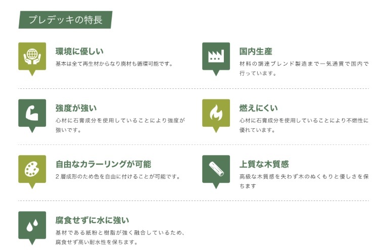 「プレデッキR」は石膏ボードの廃材、リサイクル紙粉、リサイクル樹脂などの再生材から生成されています。また、原料調達から製造まで全て国内で行っていることから、従来製品より圧倒的なCo2排出量削減を実現しています。