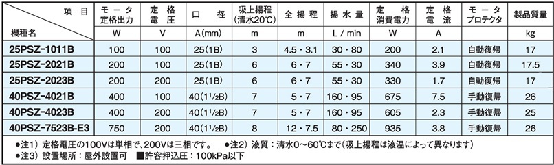 | 商品仕様 | 型式:25PSZ-2021B 電圧:西日本仕様 60Hz使用 口径:25A(1B) 吸上揚程:6m 全揚程:6/7m 揚水量:55/30Lmin 定格出力:200W 消費電力:340W 電圧:単相100V 質量:17.5kg 設置場所:屋外設置用 ※商品画像は代表機種を掲載しております。 お届けの機種とは異なる場合があります。 |