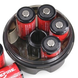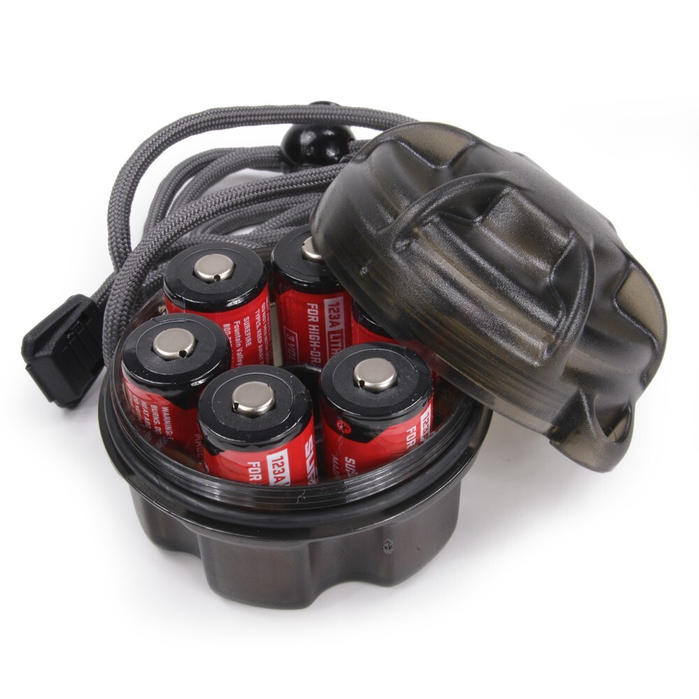 シュアファイアのバルブ 電池ケース。123Aリチウム電池6本と、ケースに適合する交換用バルブ1つを収納することが可能。蓋にはOリングが装備されており、外部からの水の浸入を防ぎます。素材には、耐衝撃ポリマーを使用しており、丈夫な作り。ランヤードも付属しています。