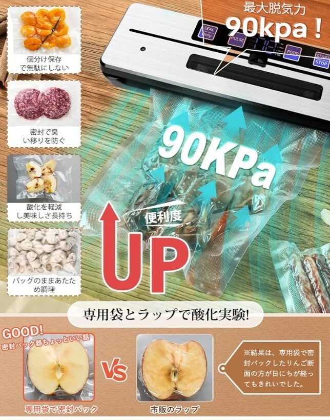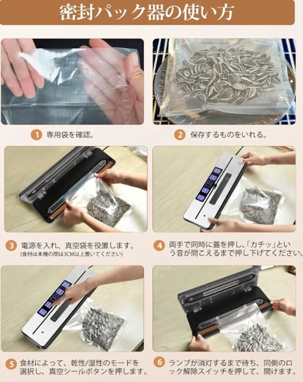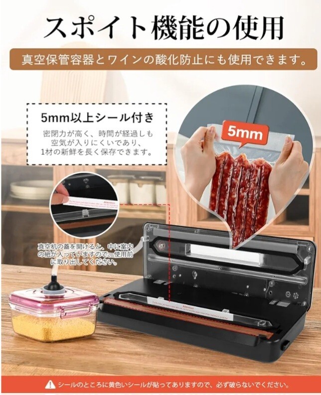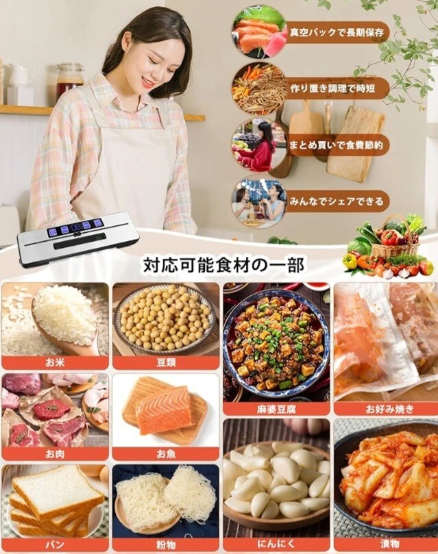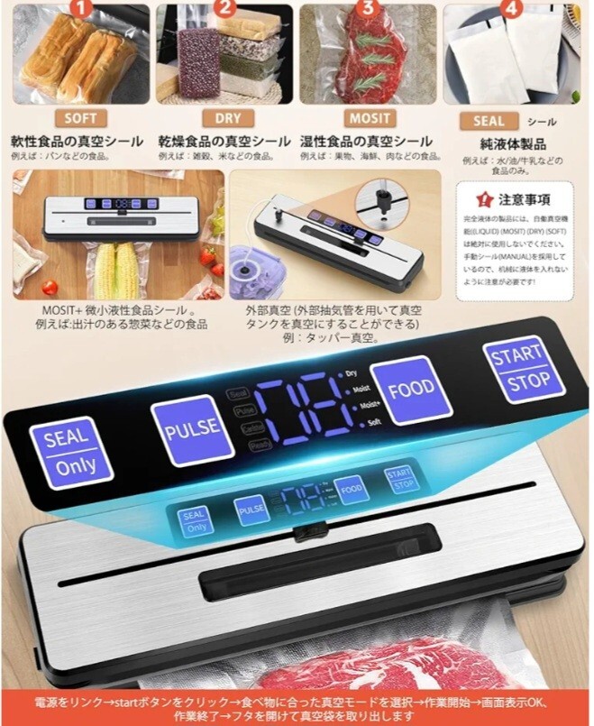 【鮮度長持ち&酸化防止】真空脱気 フー ドシーラーとして、真空脱気を通じて、フー ドの鮮度期間を延長できます。湿気やほこりを隔離し、酸化などのフー ドの劣化を有効に改善できます 、食材のおいしさを長続きさせられ、料理の味も向上します。まとめ買いした生鮮食品の保存や低温調理などに使える便利なアイテムです。この真空シーラーは、軟性食品/乾燥食品/湿性食品/微液性食品/手動真空/外部抽気真空/シールの7つのモードを備えて。参照用:(SOFT)軟性食品の真空シール:例えば:パン、餃子などの食品。(DRY)乾燥食品の真空シール:例えば:雑穀、米などの食品。(MOSIT)湿性食品の真空シール:例えば:果物、海鮮、肉などの食品。(MOSIT+) 微小液性食品シール 。例えば:出汁のある惣菜などの食品。(EXTET VAC)外部抽気真空(外部抽気管を用いて真空タンクを真空にすることができる):例:タッパー真空。(SEAL)シール:純液体製品:例:水/油/牛乳などの食品のみ。