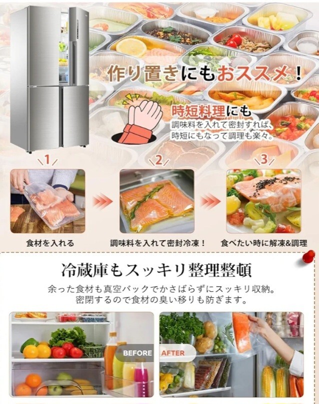 【一台多役&多様な食品に対応可能】真空パック器は高度なエアシール技術により、多種の食材に使用でき、食品の鮮度保持時間を延長し、野菜や果物の水分を維持するし、肉、魚、煮物などの食材の酸化を減らすし。お菓子、ナッツなど乾燥食材の真空保存し、酸化を防ぐ真空抽出に、食材の栄養を保存し、風味と全体的な品質を維持できます。料理が時短に用意できるための下拵えを真空パックして保存すれば、調理前の食材の洗い、切り、漬け込みなどの手順が省けて、真空パック内の浸透圧の効果で、味がより簡単にしみこみますので、マリネ、ピクルス、照り焼きなどの料理がより時短に美味しく作れます。冷凍スープ、煮物など汁気がある食材を真空パックなどこの一台だけで対応することができます。