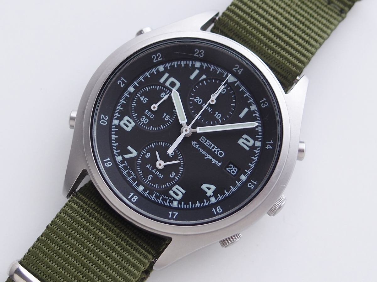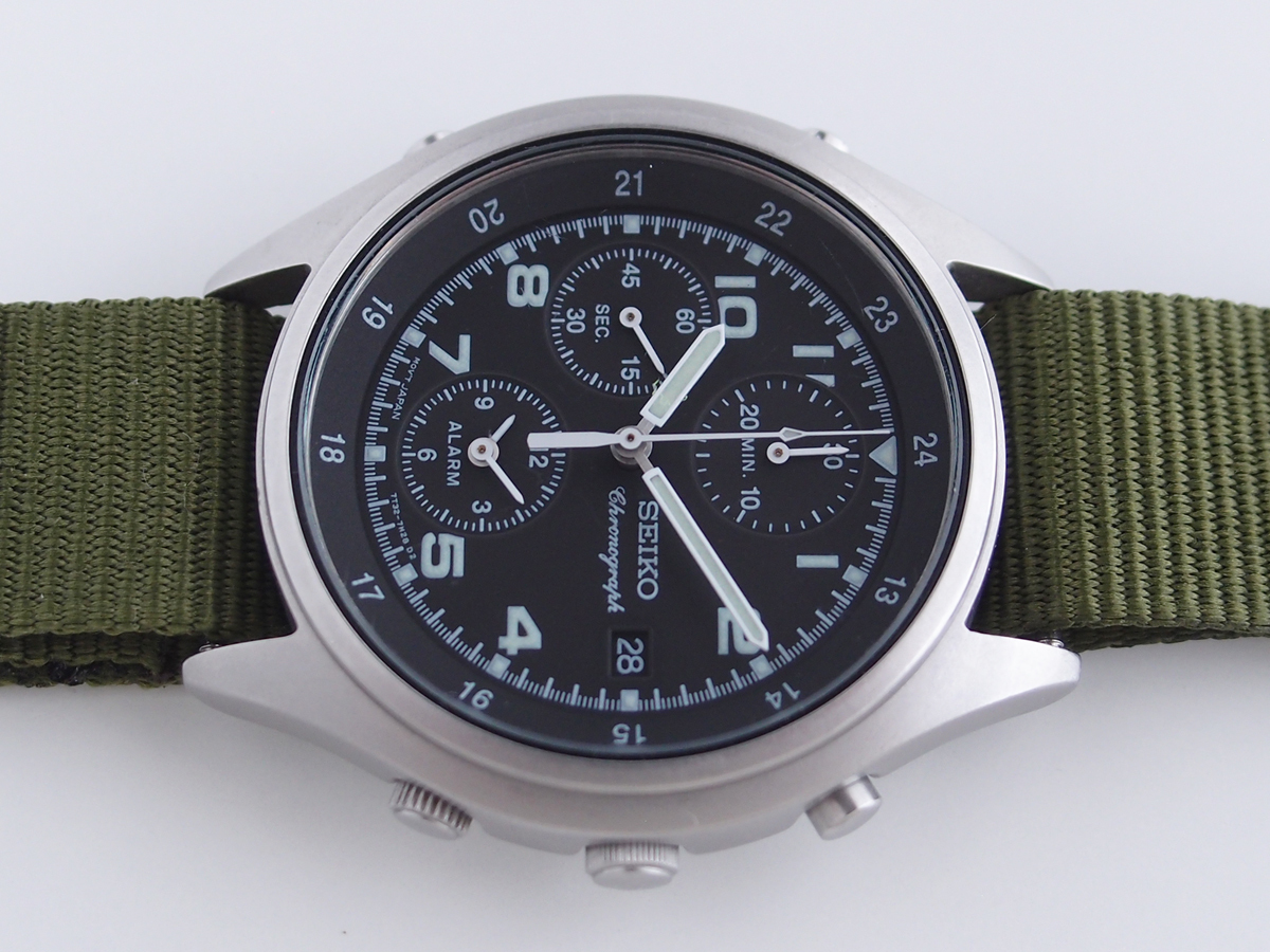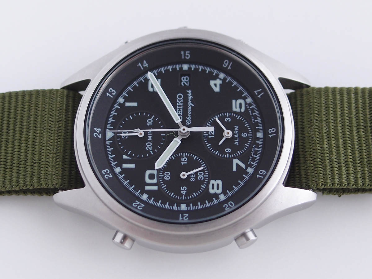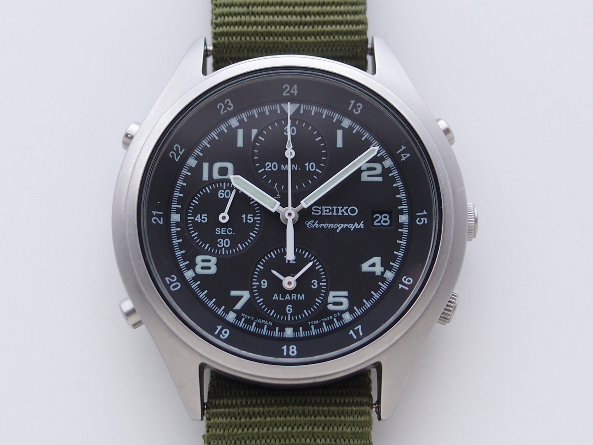 SEIKO 7T32-7E70 ミリタリークロノグラフです。稼働品。ケースサイズ:約縦44mm×横41mm。(竜頭含む)ラグ幅19mm。コンディションですが、ガラス・ケースに小キズはございますが、きれいな状態です。未使用社外ナイロンストラップが付いております。元の金属バンドも付属します。ノークレームにてよろしくお願い致します。