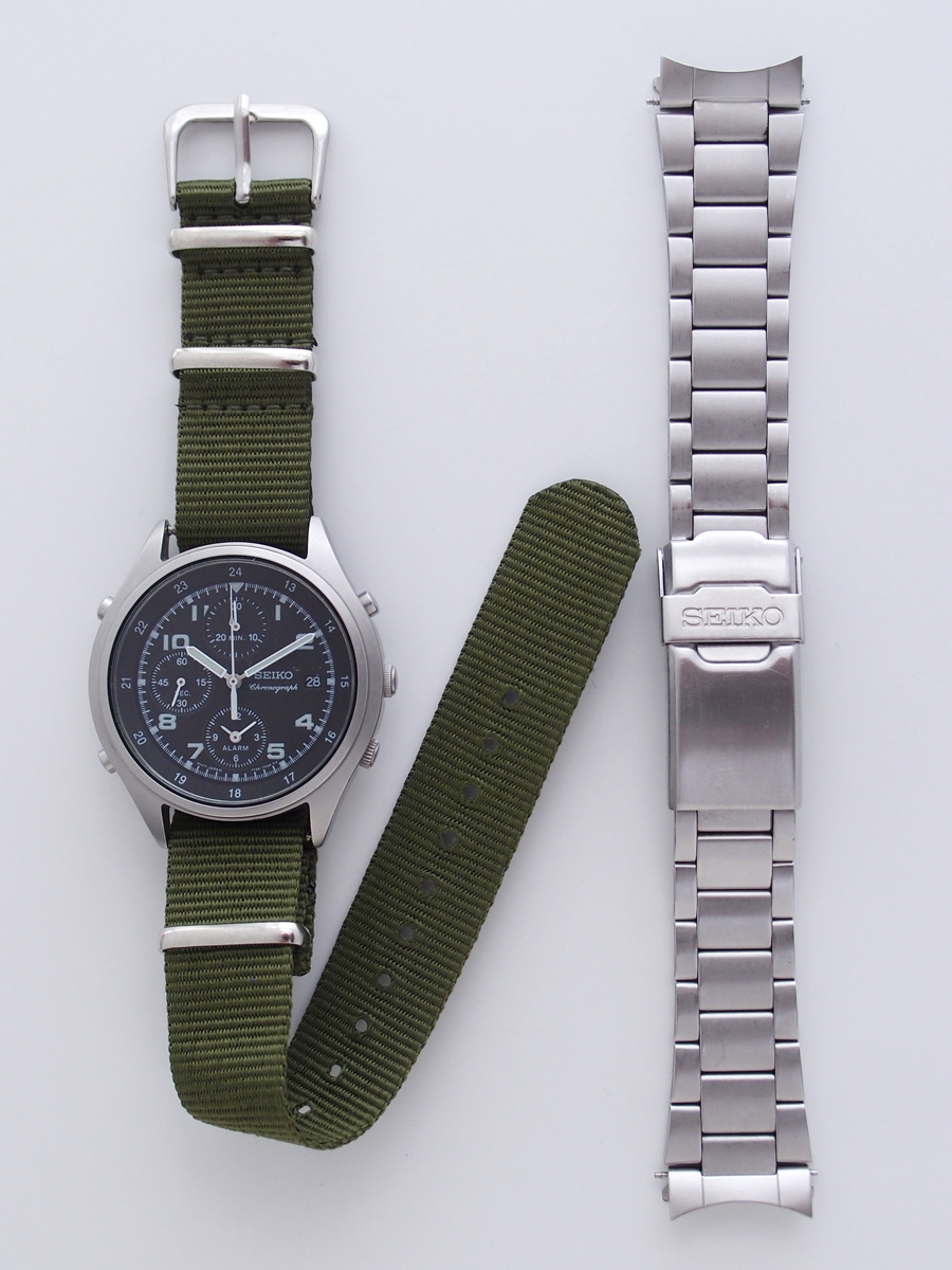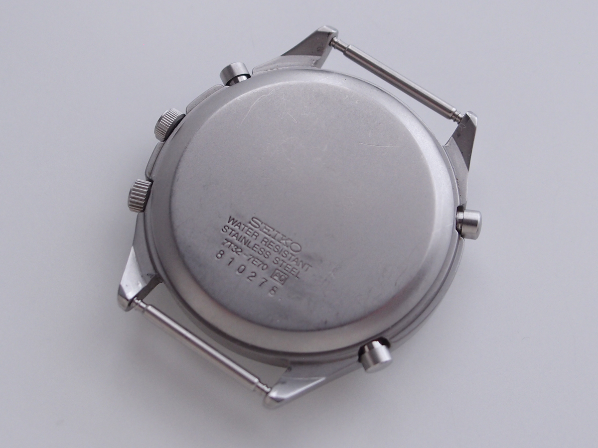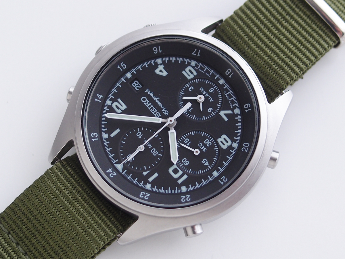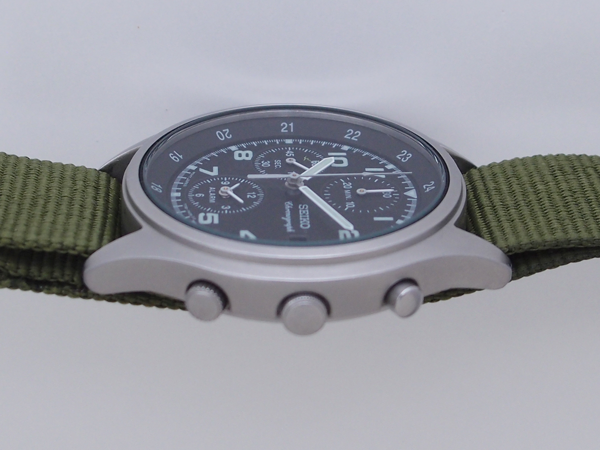 SEIKO 7T32-7E70 ミリタリークロノグラフです。稼働品。ケースサイズ:約縦44mm×横41mm。(竜頭含む)ラグ幅19mm。コンディションですが、ガラス・ケースに小キズはございますが、きれいな状態です。未使用社外ナイロンストラップが付いております。元の金属バンドも付属します。ノークレームにてよろしくお願い致します。