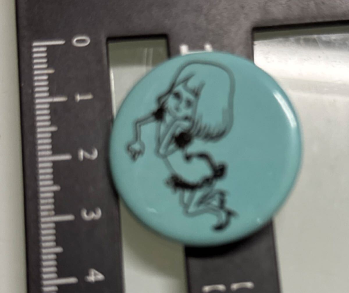 水色の丸い缶バッジで、黒い線で描かれた女性のイラストが特徴