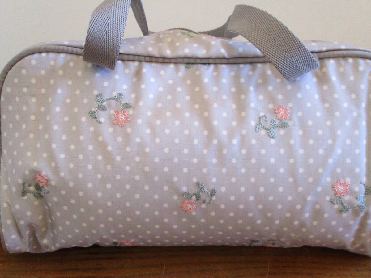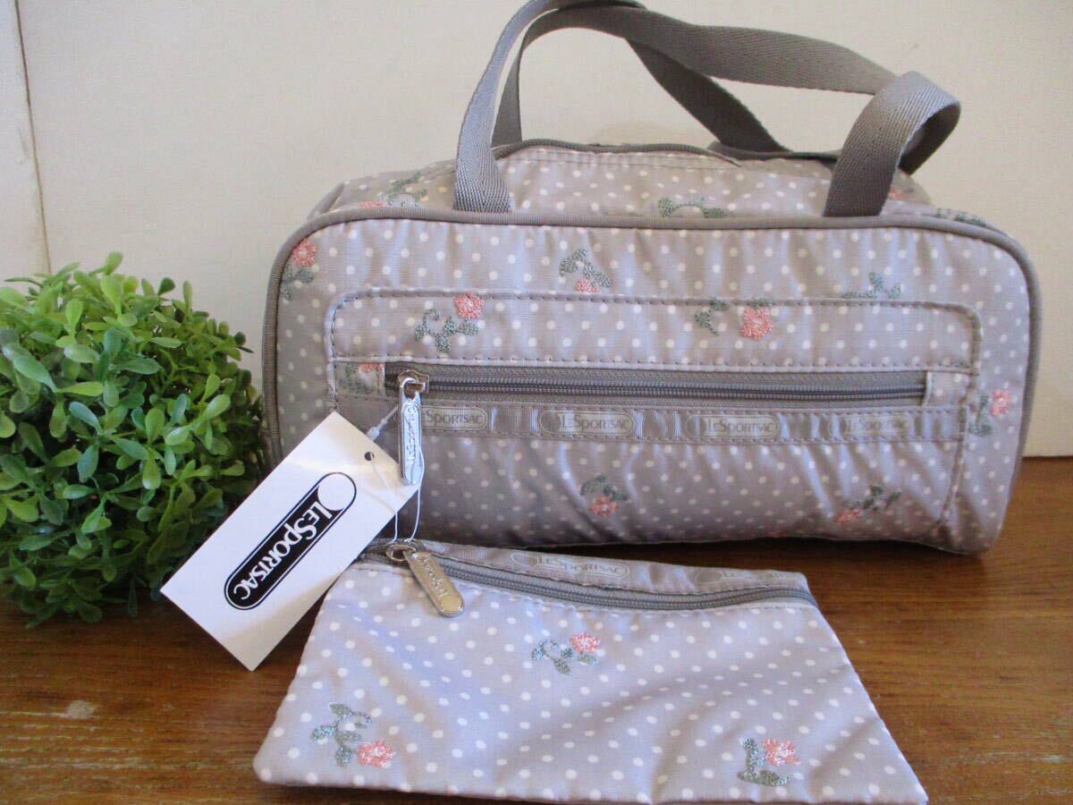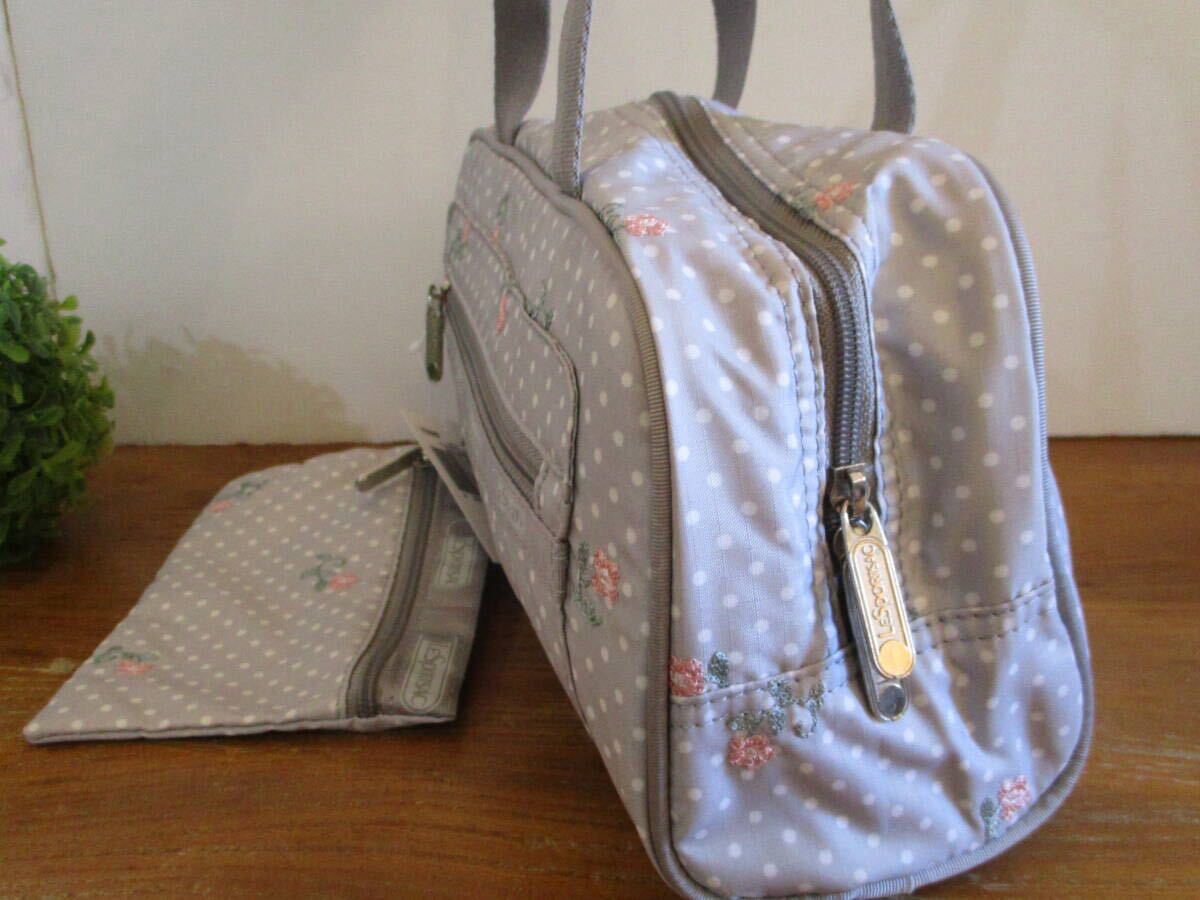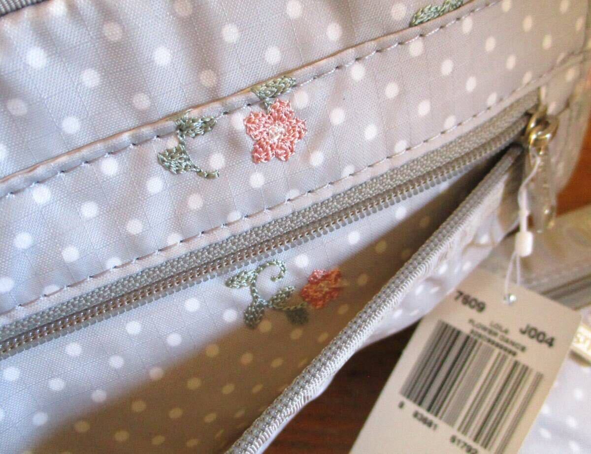 【未使用・送料込】レスポートサック LeSportsac 花の刺繍 水玉 ライトグレー ミニボストン&ミニポーチ 値札付 定価11,970円 人気 軽量 | |||